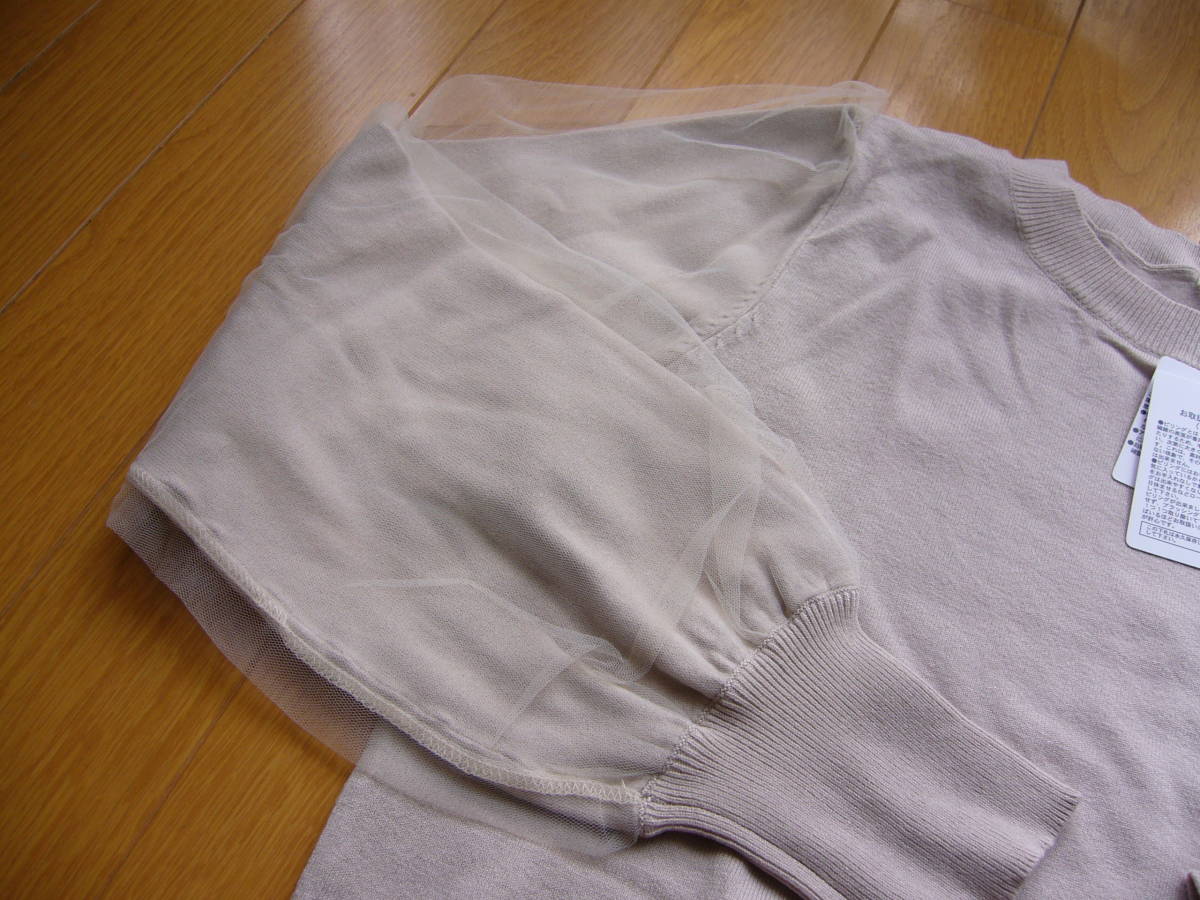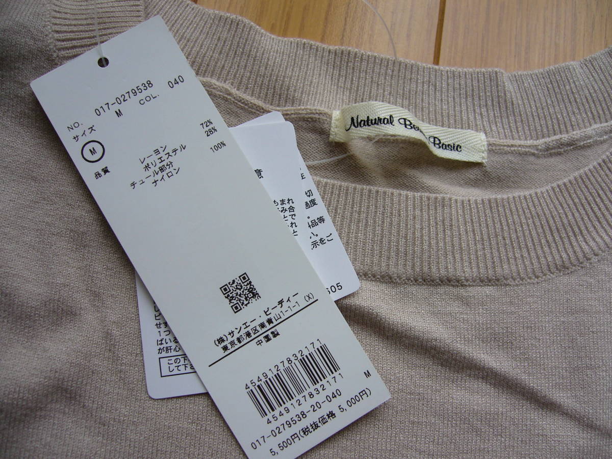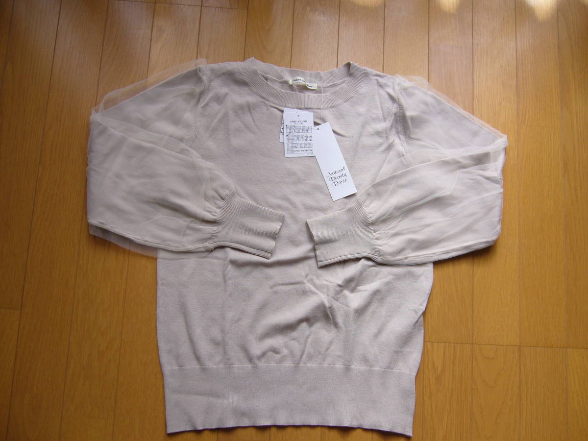 ナチュラルビューティーベーシック☆チュール袖☆ニット☆トップス☆プルオーバー☆新品です。薄いベージュ。サイズM。柔らかで手触りの良いお品です。本地の上にチュールを被せてあるデザインなので透けません。丈57バスト90肩35、レーヨン72ポリエステル28。新品。即決です。使い勝手の良い一枚だと思います。ご検討ください^^