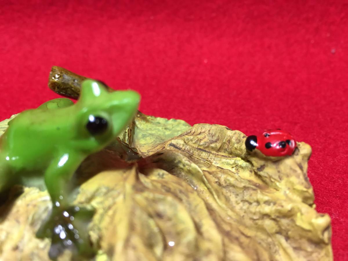 樹脂製 木の葉乗り 緑色 カエル二・テントウムシ 製品。
