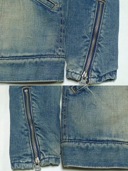 | カウボーイ・ブランド「WRANGLER・ラングラー」と素材に妥協を許さないクォリティの高さとボディ・ラインを美しく強調させるフィッティングと独自のシルエットを追求するアダルトなメンズ・カジュアル・ブランド「AKM」との別注ダブルネーム・モデルとなる内側にボア・ライニングが施されたウエスタン・スタイルのデニム・ランチ・ジャケット「24MJZ BOA JACKET デニム・ボア・ジャケット」のサイズSMALLになります。カラーはインディゴのユーズド・ウォッシュで着込んだ着込んだ感じに仕上げた中古加工と経年変化を再現したエイジング加工によりラギッドな雰囲気に仕上げたヴィンテージ・ユーズド・ウォッシュ加工が施されています。(品番S9085、定価48,000円、税込み52,800円)。WRANGLERの名品フロント・ジップ・ジャケット「24MJZ」のデザインを取り入れた「AKM」別注のスリムなフィッティングとシルエットに拘って製作された袖にジッパーが付くライダース・スタイルのオリジナル・ボア・ジャケットになります。素材に左綾デニムを使用し、内側に肌触りが良く保温性の高いボア・ライニングが施されたており、袖内側はヴィンテージ・タイプの厚手のコットン・フランネル・クロスがライニングされています。フロント・プリーツの閂止めは銅褐色のリベット留め、フロントはジップ・フロントでジッパーはUNIVERSAL(YKK)製オートマチックの上下開閉が可能なダブル・ジッパーを使用(ベル型プル)、袖ジッパーも同じタイプの物を使用しています。トップ・ボタンは「Wrangler」刻印の入る銅色のネオバ・ボタン、フロント両胸にサイレントWステッチの入るスナップ留めのフラップ・ポケットでスナップ・ボタンは「Wrangler」刻印の入る銅色のYKK-PERMEX製ボタン、両腹部に片玉縁のハンド・ポケット、背面に動きやすいアクション・プリーツ、袖裏にはパープル・チェックのフランネル生地がライニングされています。ラベルは「Wrangler」ブルーベル・マークの入る白四角ラベルと「AKM」の黒四角ラベルがそれぞれ縫い込まれています。「AKM」らしいスリムなシルエットが採用されていますので袖と身幅ともに細身に仕上げられています。全体的にヴィンテージな雰囲気に仕上げた手の込んだ中古加工が施されています。状態は元々ユーズド加工が施されたモデルで全体的に使用感のある仕上がりになっています。実際の着用による使用感のほとんどないキレイな状態でデニム生地のアタリやスレも無く、シミなどの汚れた箇所は無く、内側のボアも衿のヨゴレや毛ヌケ、ネップ(毛玉)なども見られずキレイな状態で、袖内側のフランネル生地も穴あきや破れなどのダメージも無く、全体に使用感の少ない試着程度の使用感の非常に良い状態になると思います。実寸は肩幅(直線で)約41cm、着丈(衿下より)約61cm、身幅(腋下で)約48cm、袖丈約64cmとなります。(素人採寸ですので多少の誤差はお許し下さい。)素材表示は表地綿100%、裏地基布ポリエステル100%、裏地ボアパイルポリエステル70%、アクリル30%、袖裏地綿100%。中国製。「WRANGLER・ラングラー」と「AKM」と共同企画で2009年に販売されたダブル・ジッパー仕様のスリムなフィッティングが可能なモデルでバイクのライディングなどにも最適なフロント・ジップの防寒性の高いデニム・ボア・ジャケットになります。 | |||