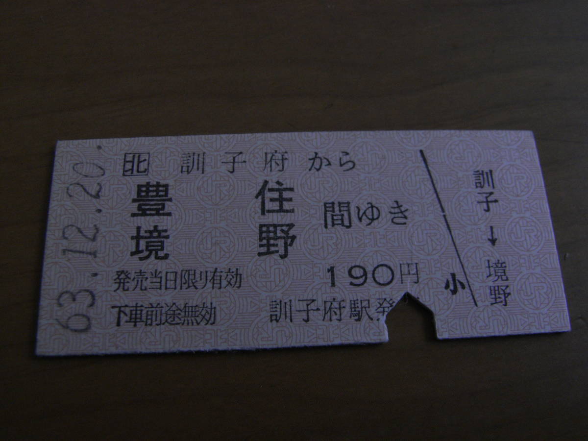 池北線 訓子府から豊住 境野 間ゆき 190円 昭和63年12月20日 訓子府駅発行