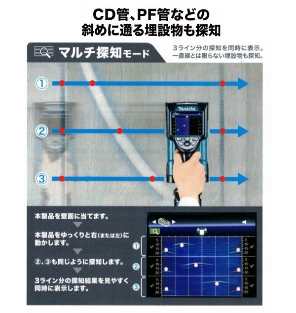 ●マキタなら斜めに通る埋設物も分かりやすく探知