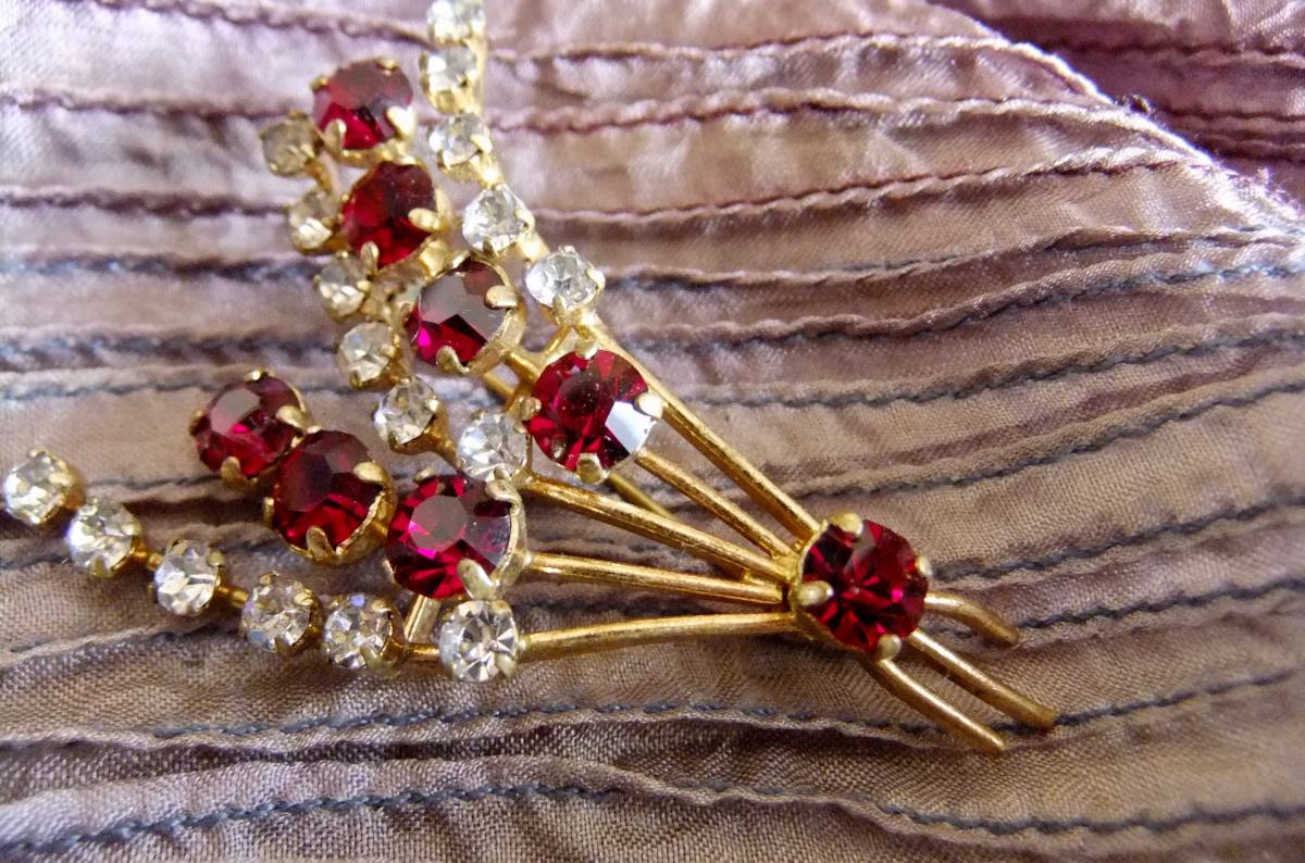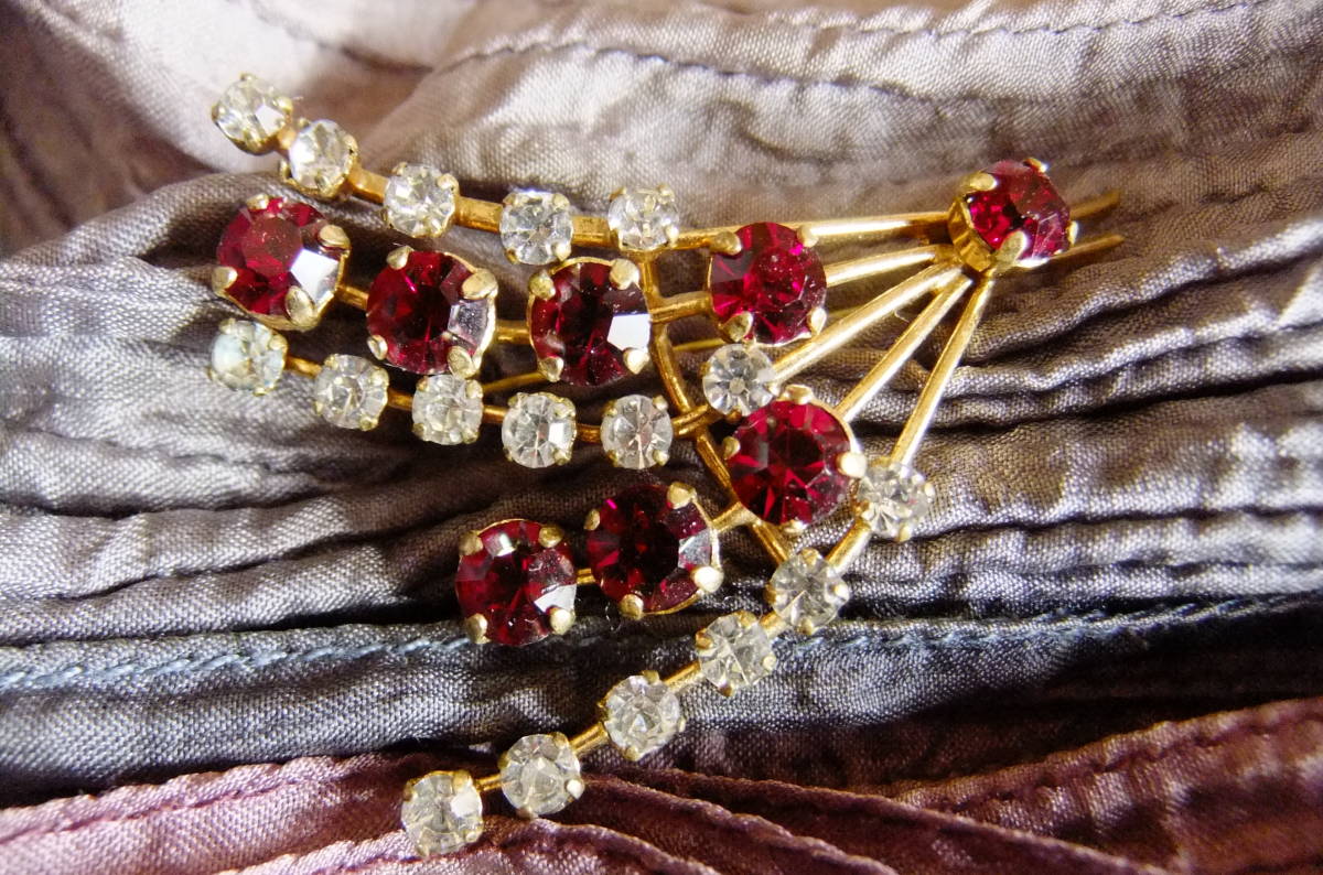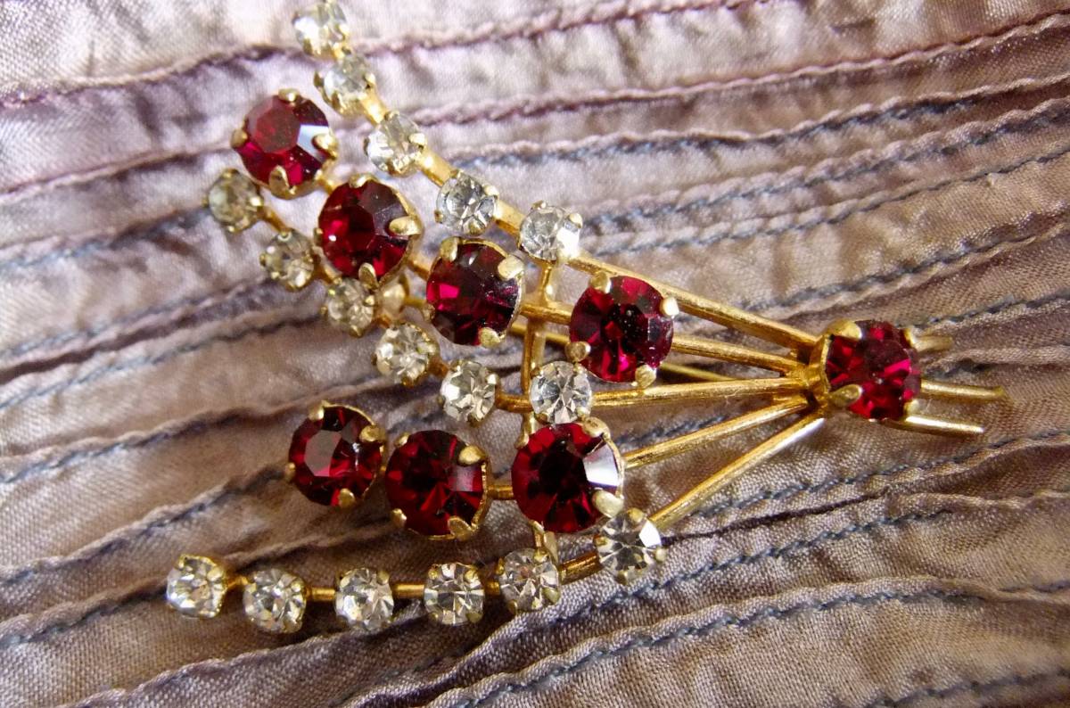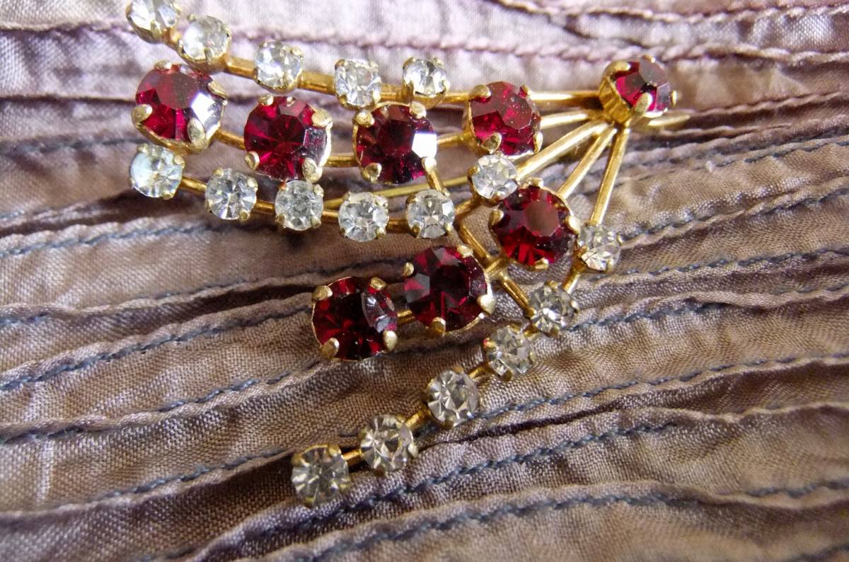 ヴィンテージ:レッド、クリアカラーストーン、植物デザインのブローチ