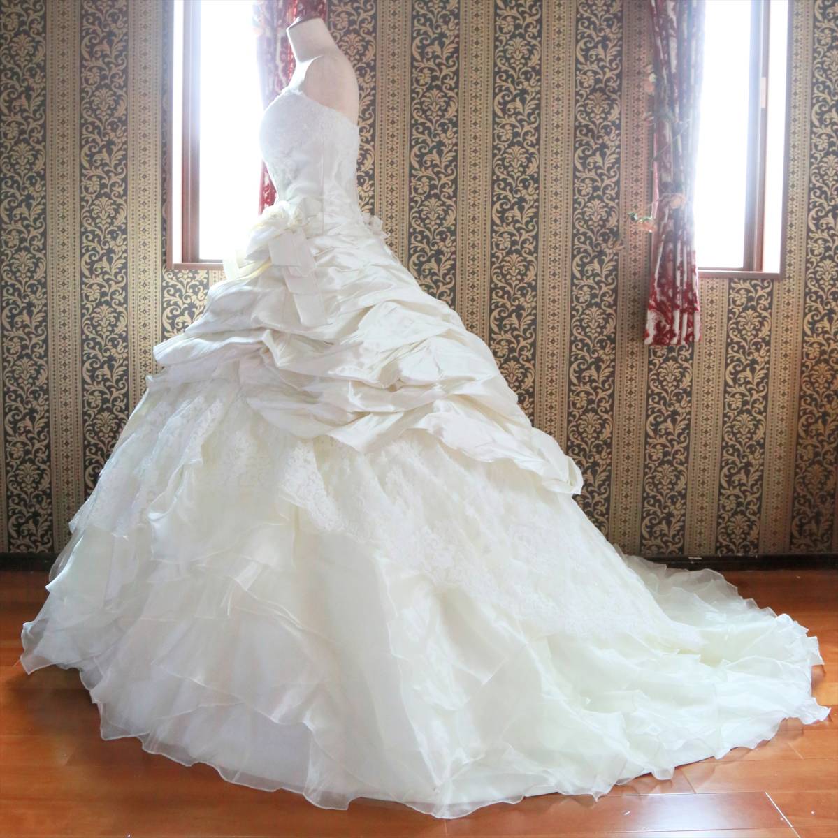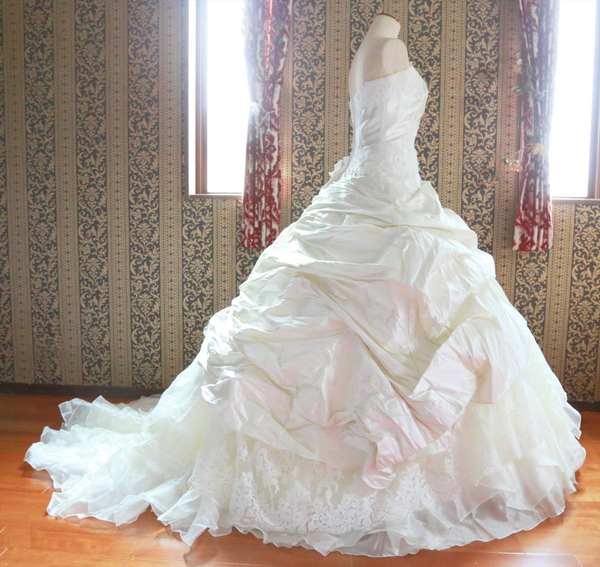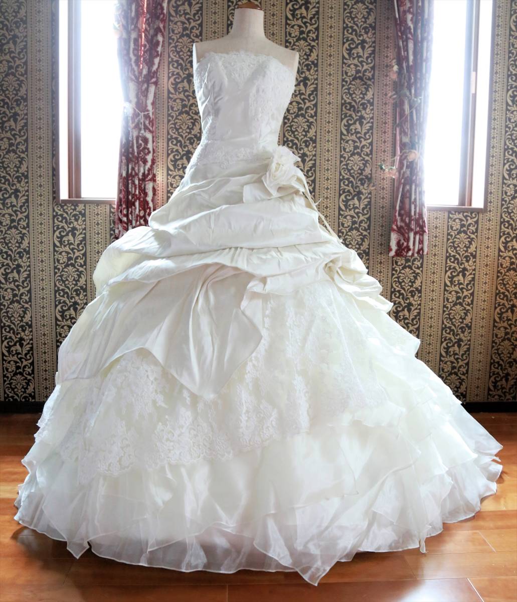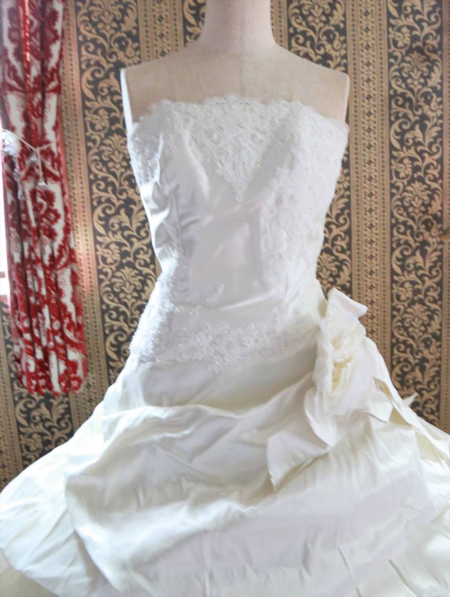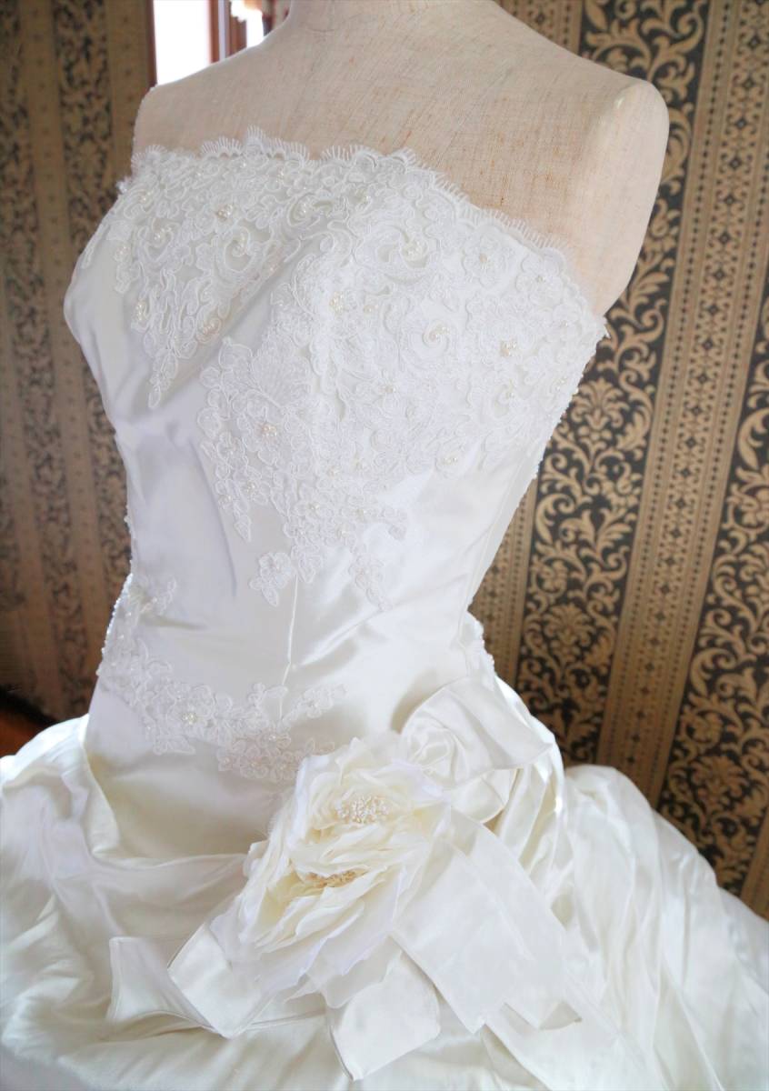 状態は綺麗な方だと思いますが、式場等で使用されるクラスのドレスはレンタルするだけでも高額な品ですし、生地が多く繊細な商品ですので、多少の糸引き・ビーズ取れ・小傷など多少の事はご理解ください。