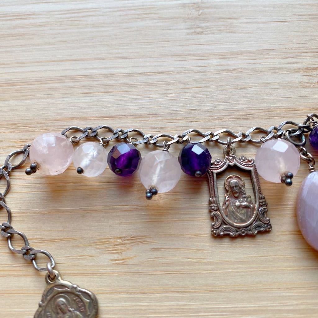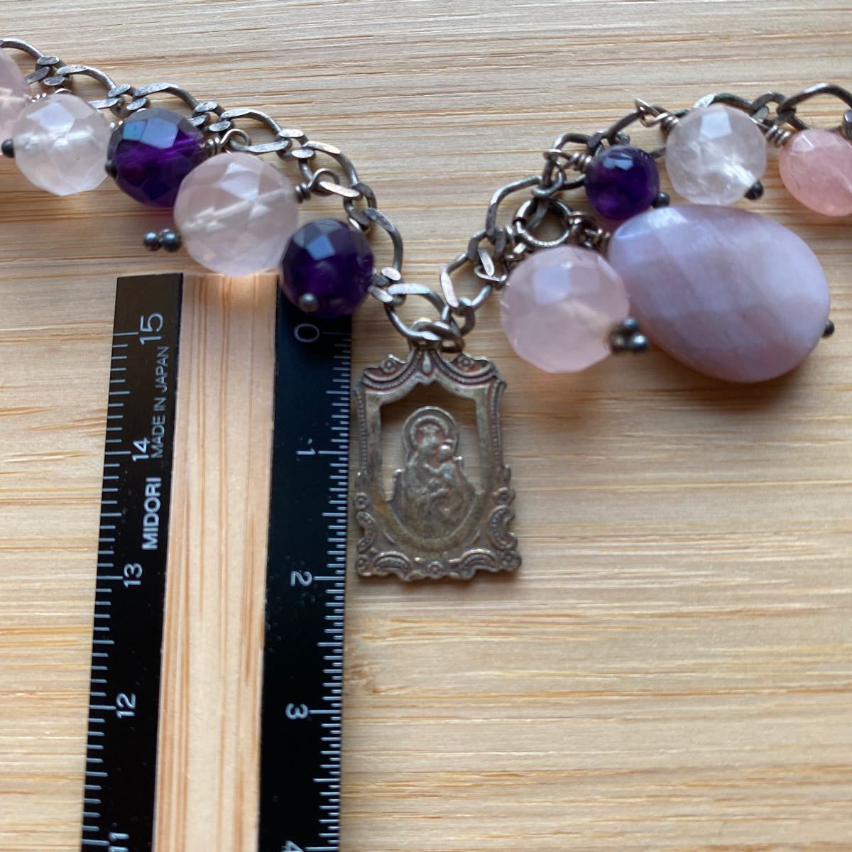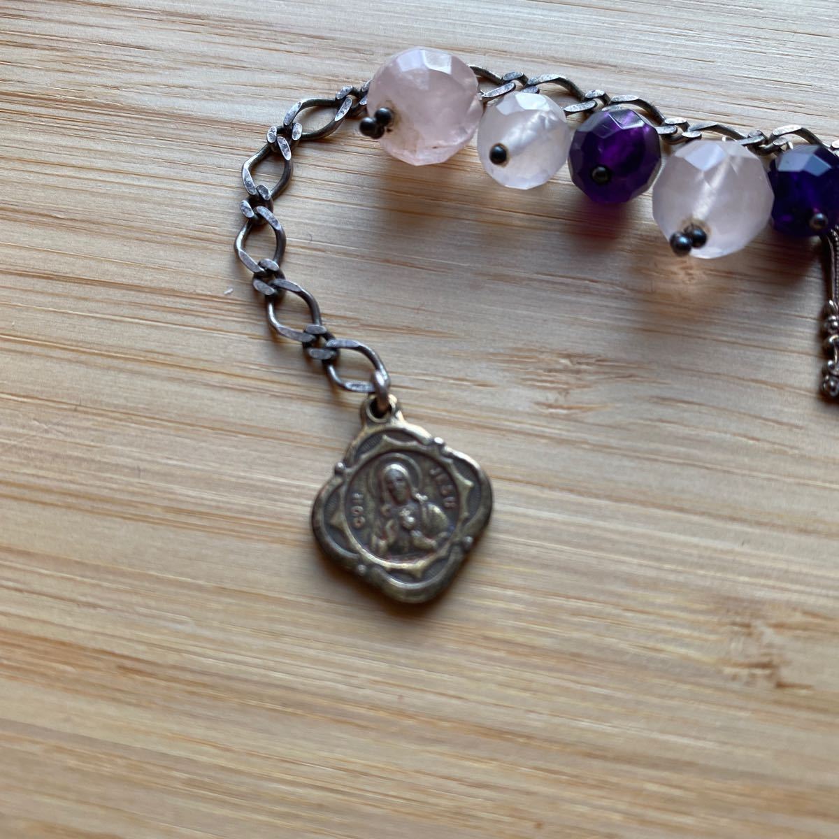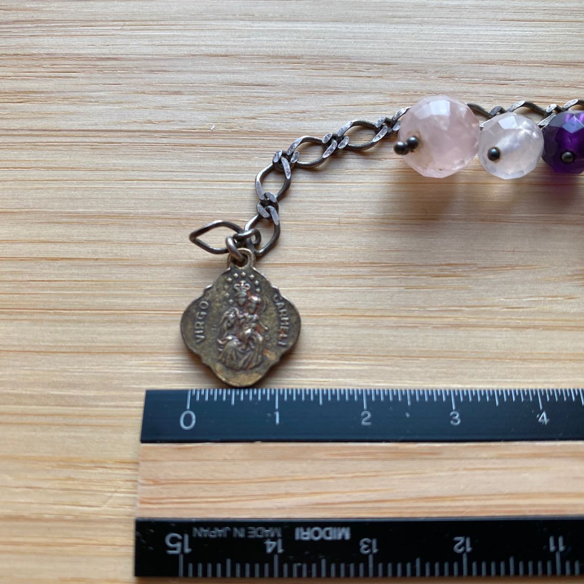 天然石 ブレスレット アンティーク調 ヨーロッパ メダイ マリア 18000円 18cm Rose Quartz amethyst Antique gemstone Silver bracelet