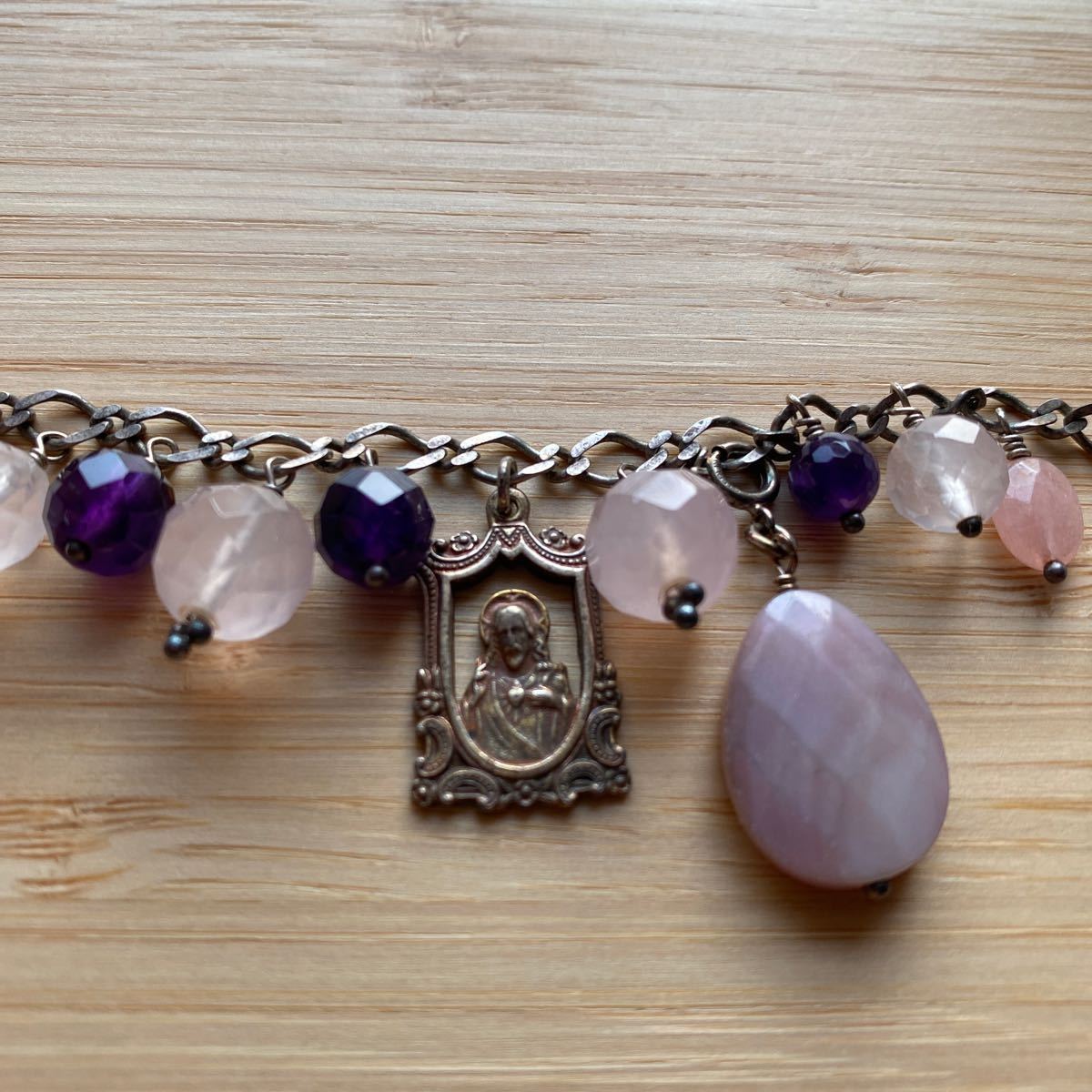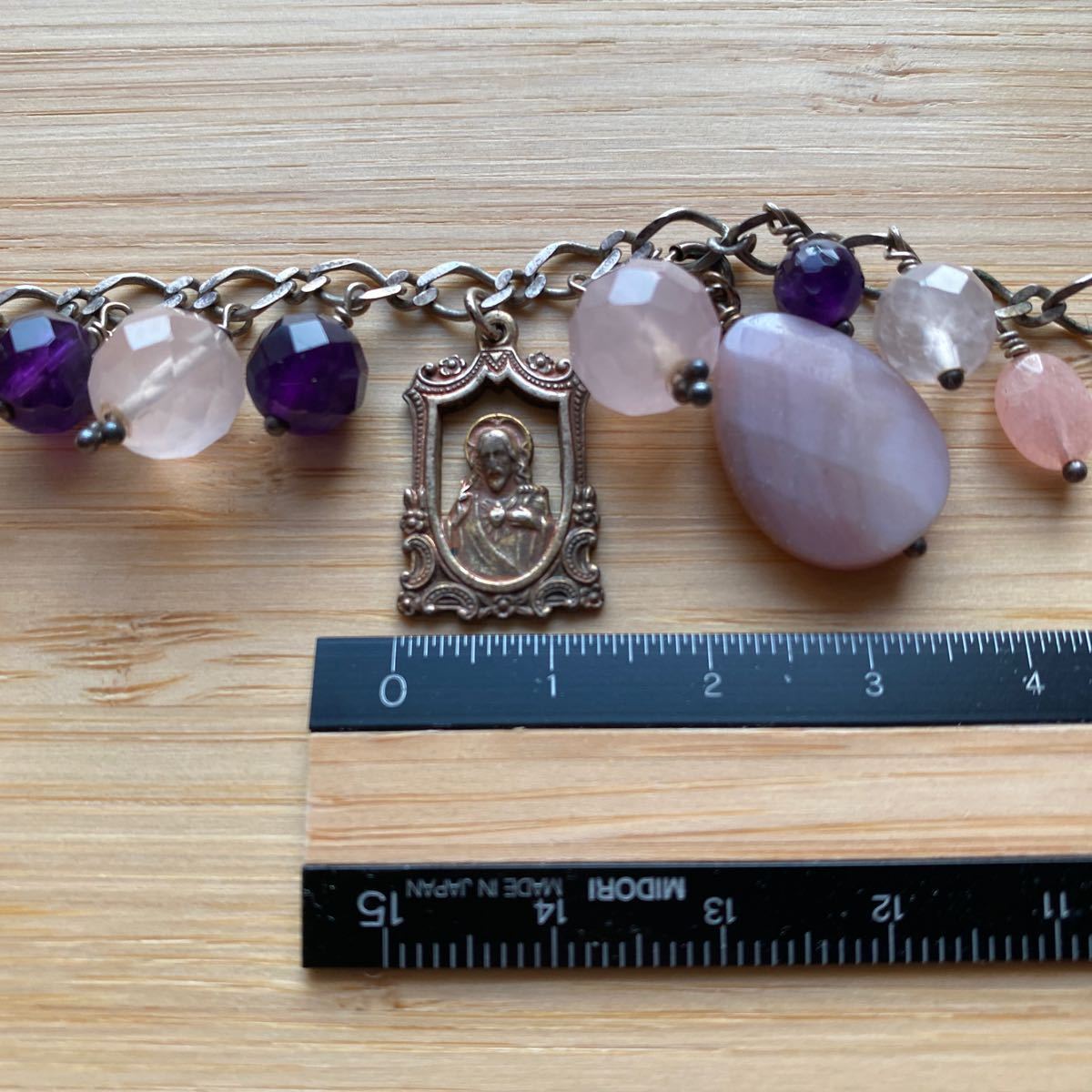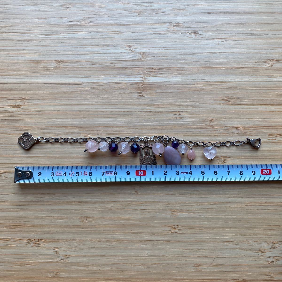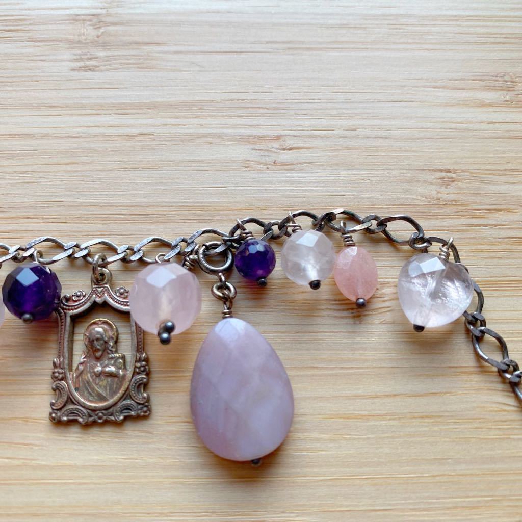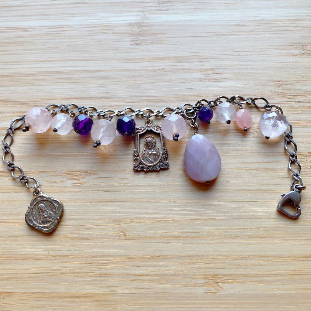天然石 ブレスレット アンティーク調 ヨーロッパ メダイ マリア 18000円 18cm Rose Quartz amethyst Antique gemstone Silver bracelet