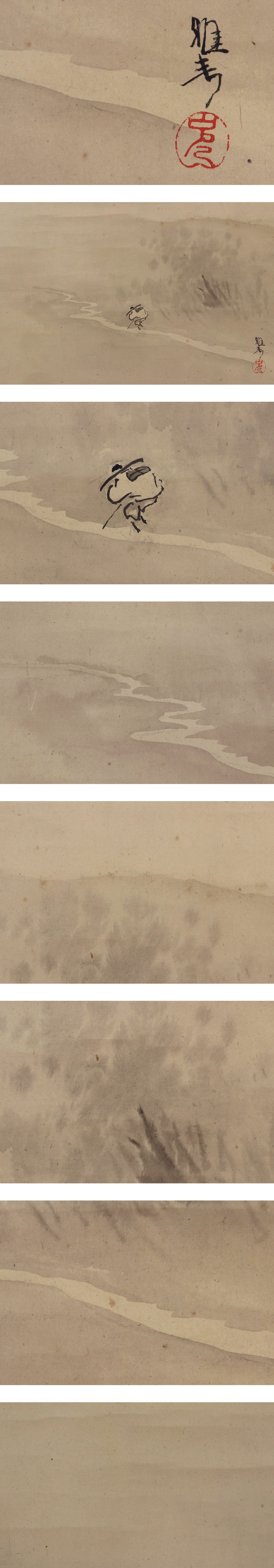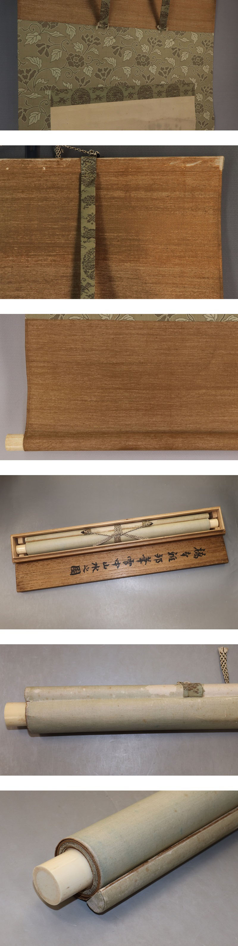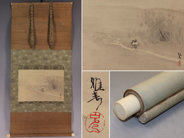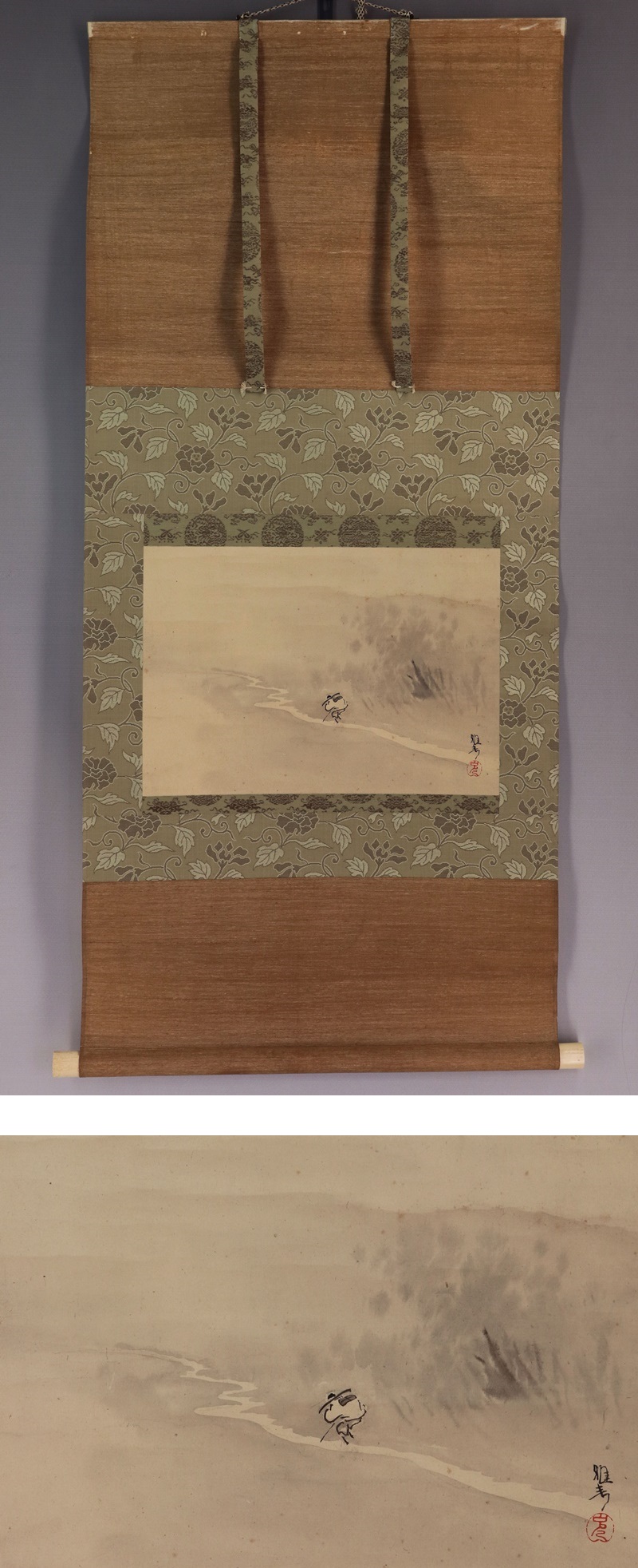 橋本雅邦 はしもと-がほう(1835-1908) 明治時代の日本画家。天保6年7月27日生まれ。江戸出身。 幼名は千太郎,のち長卿。狩野雅信に入門。 フェノロサ,岡倉天心らの鑑画会に参加し,狩野芳崖らと新画風を開拓。 明治23年東京美術学校(現東京芸大)初の日本画教授となる。 31年辞職して天心とともに日本美術院を創立した。 明治41年1月13日死去。74歳。 本紙は、染み、強い折れ、皺、ヤケがあります。 表装は、染み、汚れ、折れ、皺、虫食い、破れ、ほつれがあります。 【サイズ】 作品 横約38.5cm×縦約27cm 表装 横約51cm×縦約113cm |