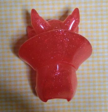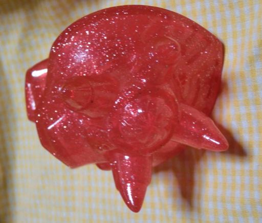 ミニソフビで全高6.5㎝位。画像中黒点のようにみえる部分はラメです。全体にある程度状態を保っていると思います。