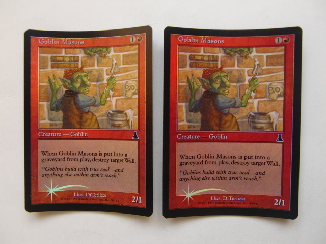 B知人の委託品です。 画像が全てです。 MTG ゴブリンの石工/Goblin Masons foil 英語2枚です。 何語だか分らない時があります。 エキスパンション、外国語(言葉)は画像で確認をお願いします。 カードはプレイしています。 程度はカードに目立つ擦り傷、キズ、ペン跡のようなキズ、汚れ、角や端に傷、黒枠にキズ、などのキズが結構あります。 スリーブに入れないでストレンジボックスに保管してたので擦り傷が沢山あります。 カードからタバコや香水の匂いがします。 カードが大きく丸まっていたり反ってたりしています。 気が付かない部分がありますので程度を気にする方は入札をご遠慮下さい。 程度はジャンクです。 コレクションには向きません。 何か起きた場合には自分では対応が出来ませんのでご理解頂ける方のみ入札をお願いします。 普通郵便で発送します。 郵便事故や郵便破損が起きた場合には保障できません。 ノ-クレーム、ノーリターンでお願いします。