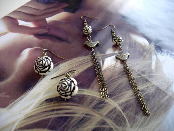 ルーズ・シルエット・・シリーズです♪シックな薔薇・・薔薇と小鳥さんのピアスです♪デザイン違いのペア2組です♪大きな薔薇と小さな薔薇と可憐な小鳥さんを繋いでアンニュイな表情です♪アイボリーホワイトの樹脂 薔薇は10ミリと14ミ大きさ違いです♪長さは大きな薔薇のピアスが全長4センチ位です♪小さな薔薇と小鳥さんのピアスが12センチ位です♪イヤリングにも変更出来ます♪お揃いのネックレスやブレ スレットも出品しています♪シンプルでいつまでも着けられるデザインを考えて作りました!ハンドメイドをご理解頂いてノーク レーム、ノーリターンでお願いします