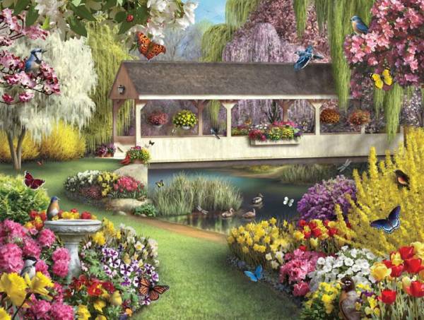31303 MAS 300 ラージピース ジグソーパズル 米国輸入 美しい庭 春の庭園の橋 蝶、鳥、川、自然の田園 風景 アヒル