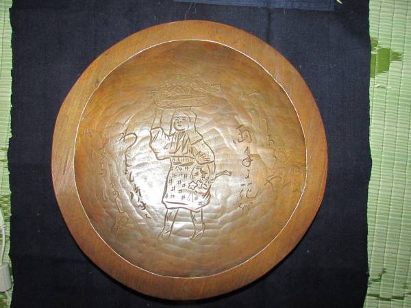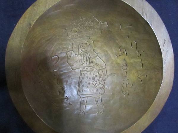 (旧家・蔵出し)(古い味わいのある花売り娘木彫鉢)貴重珍品