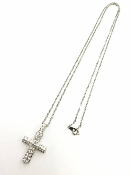 状態は良好です 。立体感がある十字架のペンダントはダイヤのような透明ストーンが敷き詰められておりゴージャスで高級感があります。 写真のように裏面はシンプルなデザインなのでこちらを表面にして着用しても素敵かと思います。二通りのオシャレを楽しめるのではないでしょうか!