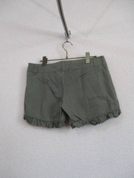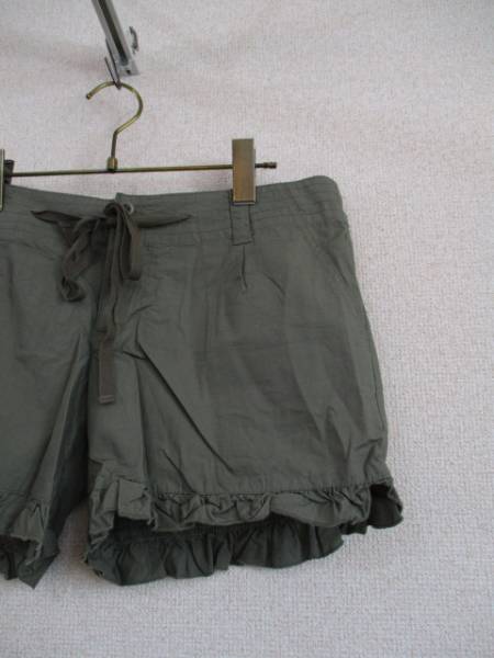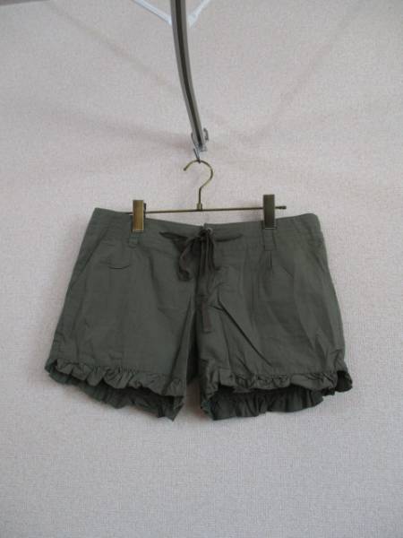 | 商品紹介 | カーキのショートパンツです。 裾のフリルがデザインのポイントになっています。 ウエストにはひもが通っていて、中央で結ぶようになっています。 《素材》 綿100% |