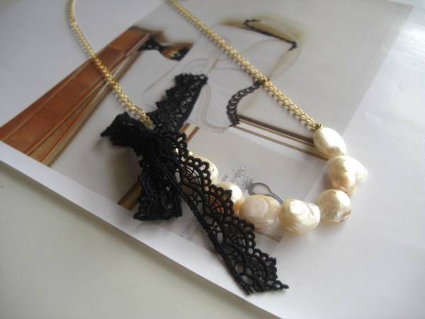 アンニュイな秋色・・シリーズです♪ロマンチックな夜に・・繊細なオフ;ホワイトのバロックの淡水パールのネックレスです♪母貝つ きの13ミリから18ミリ位の大きなバロックパールに黒のレースリボンを合わせてロマンチックな表情です♪リボンは取り外しできますのでシンプルなデザインでも楽しんでいただけます♪ネックレスの長さは全長85センチ位で調節自由です♪短く チョーカー風に着けられても可愛いです♪お揃いのブレス レットも出品しています♪ハンドメイドを ご理解頂いてノークレーム、ノーリターンでお願いします