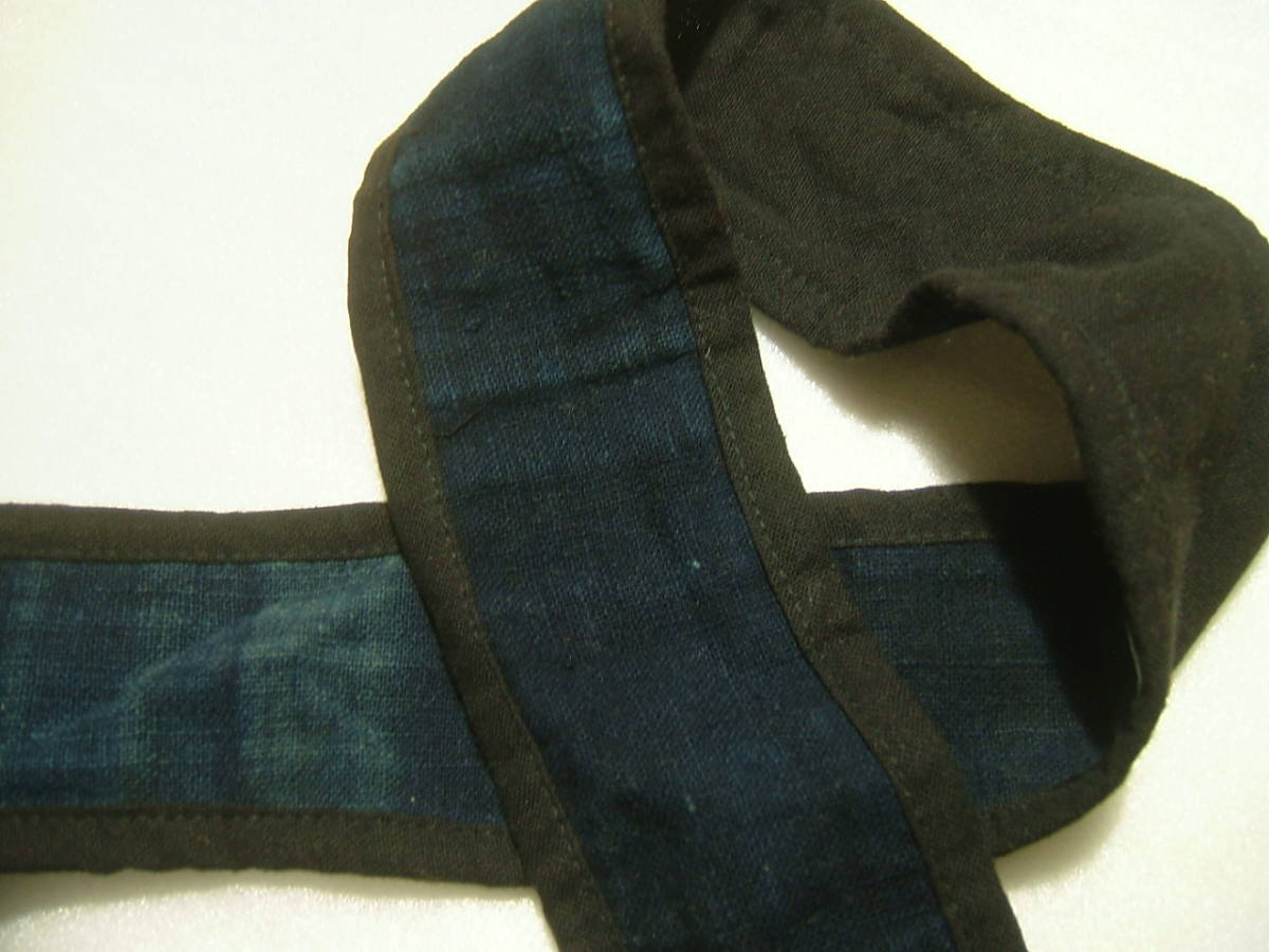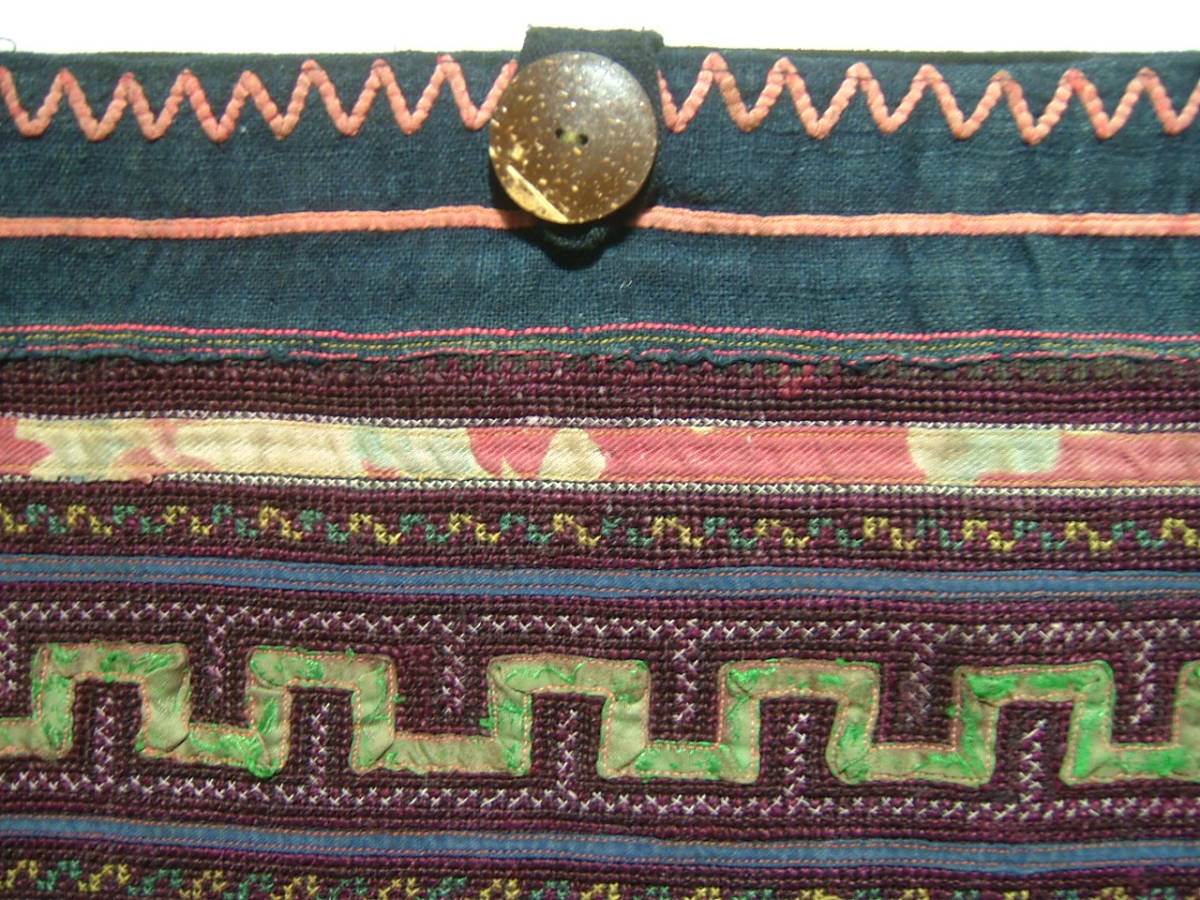 濃紺の藍染麻布にモン族伝統のステッチ、アップリケが施されています。