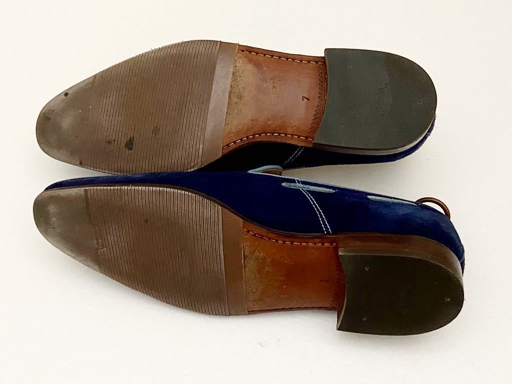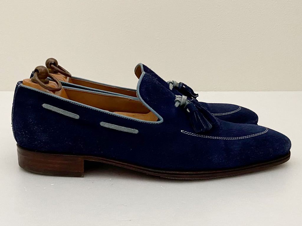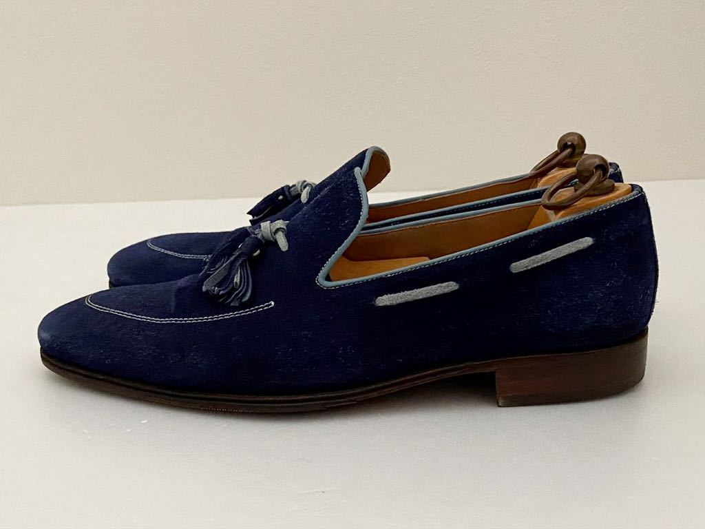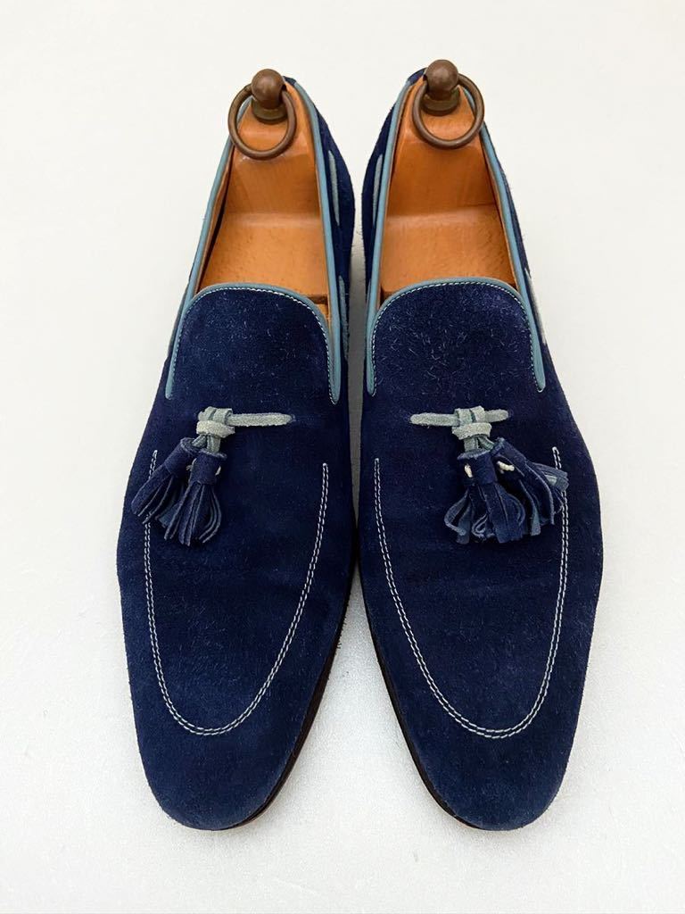 ・落ち着いたブルーの風合い良い上質なスエードレザーを使いすっきりモダンで美しいシルエットにタッセル使いや発色の良い綺麗な水色のパイピングデザインが雰囲気抜群でお洒落なスリッポン、ローファーになります。