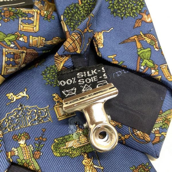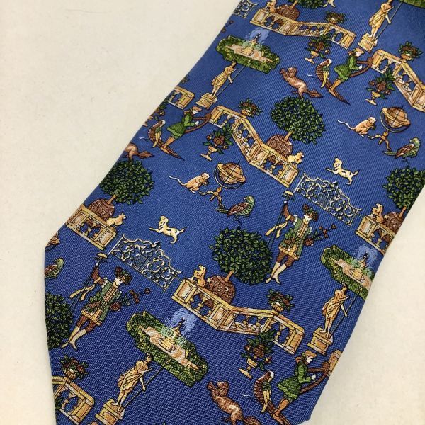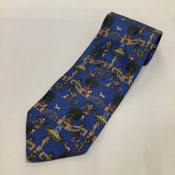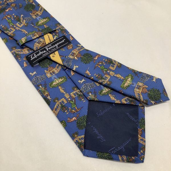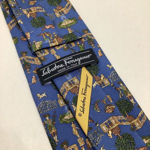 良品 Salvatore Ferragamo サルヴァトーレ フェラガモ イタリア製 総柄 噴水柄 ネクタイ シルク 絹 100% ブルー 青