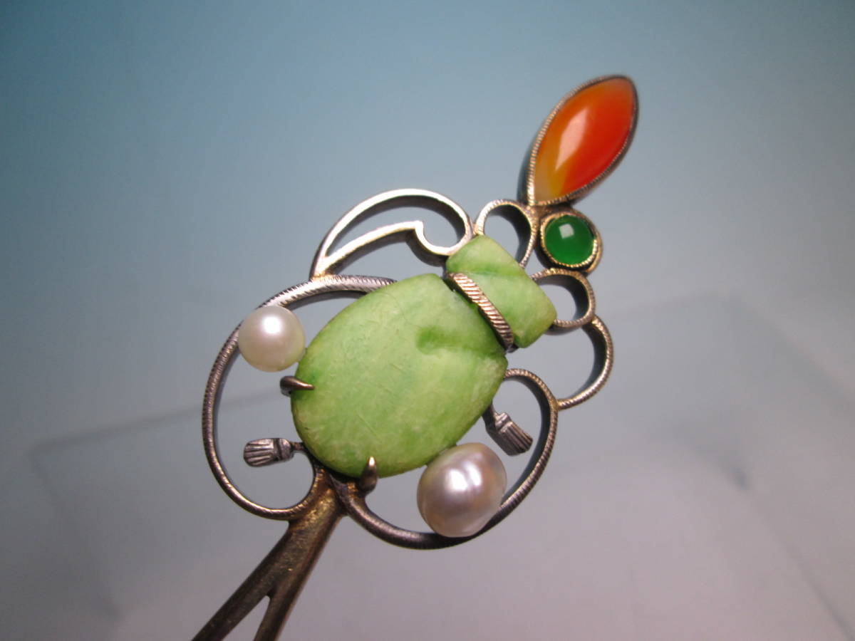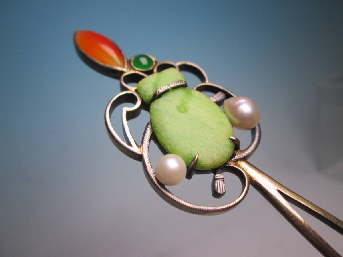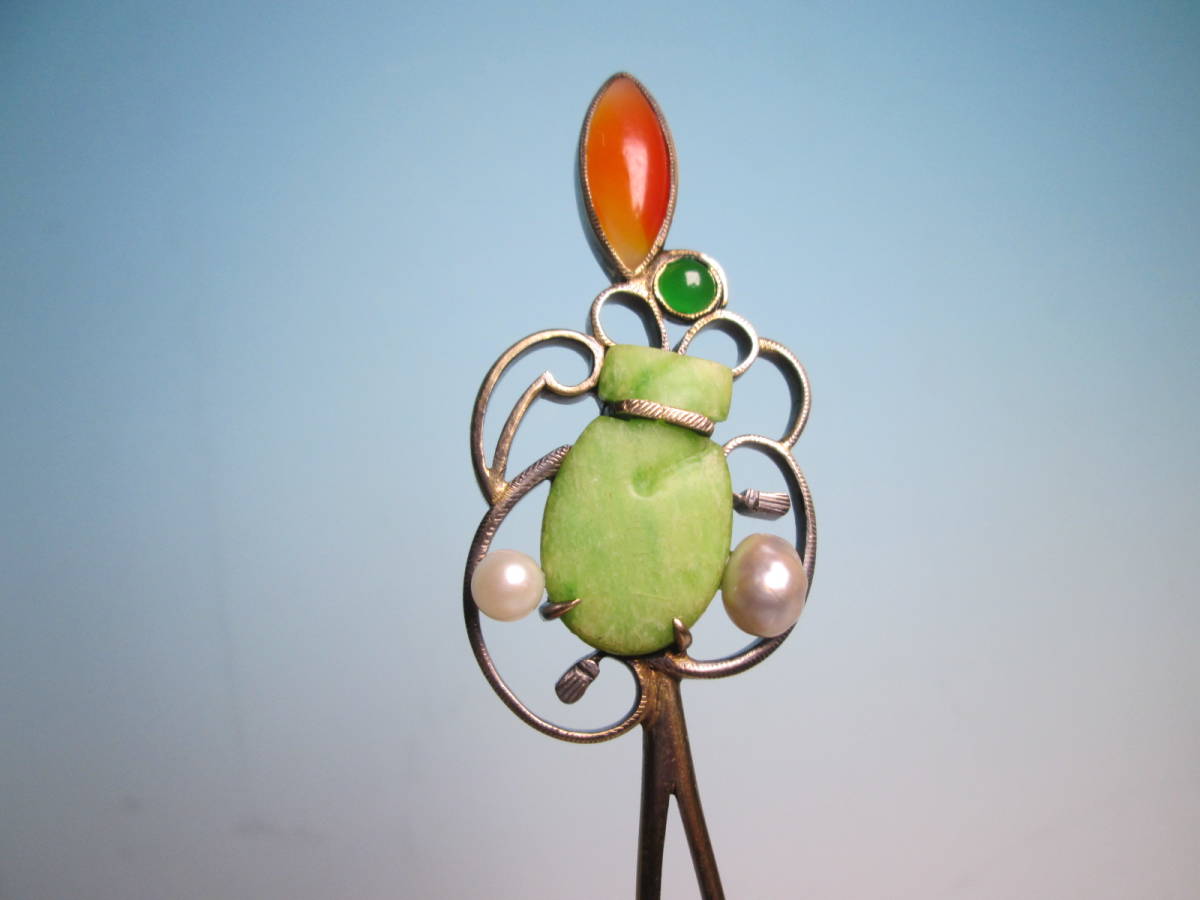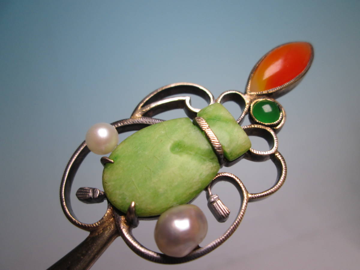 【江月】アンティーク・大振り 21,2cm 緑石本瑪瑙真珠飾り宝袋のかんざし 19,14g