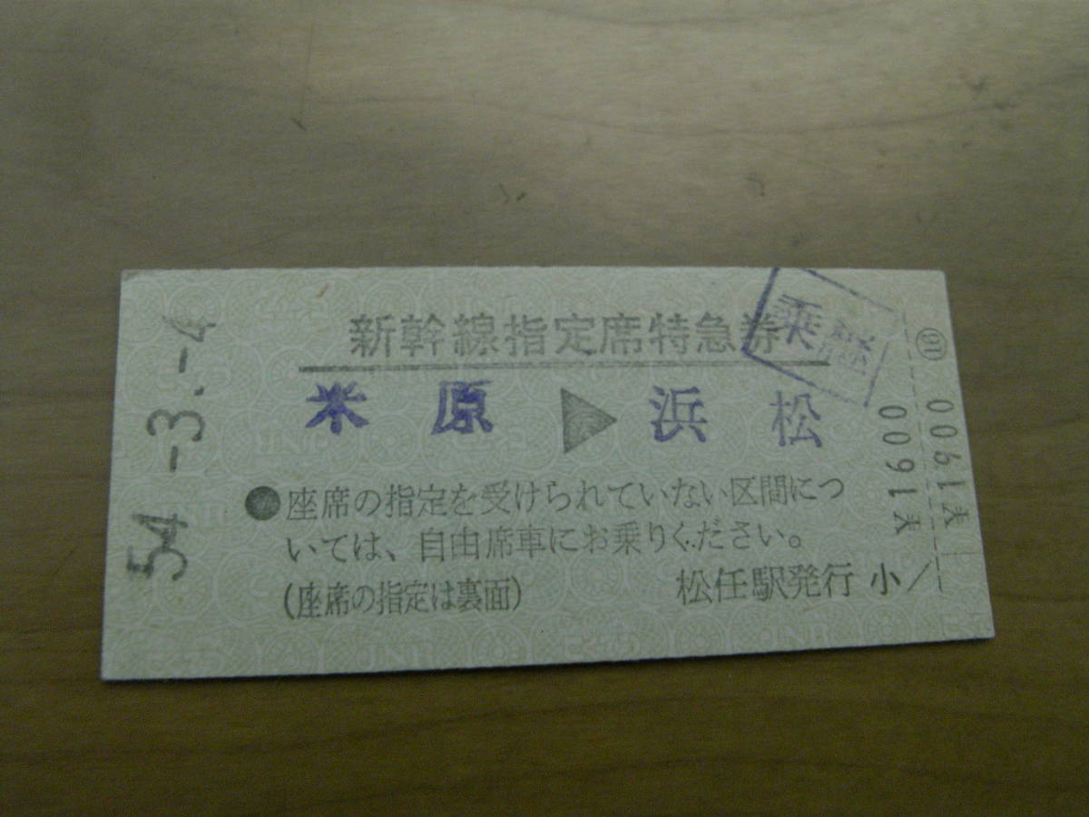 新幹線指定席特急券 米原→浜松 昭和54年3月4日発行 松任駅発行
