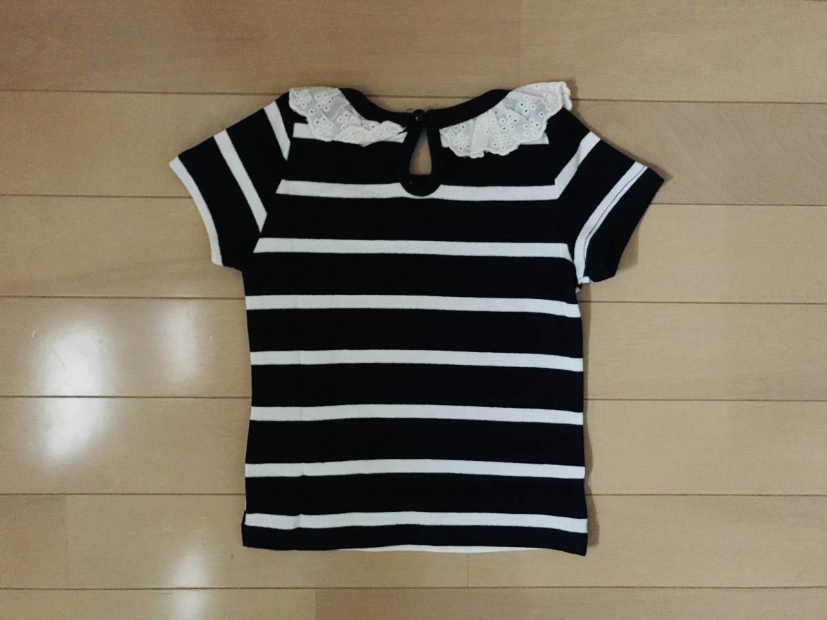 レース襟に、後ろにはぼたん、周りと差がつくボーダーTシャツです。