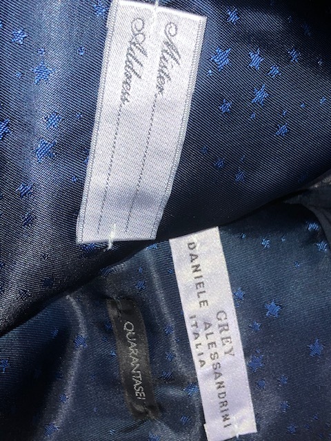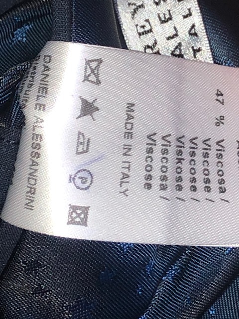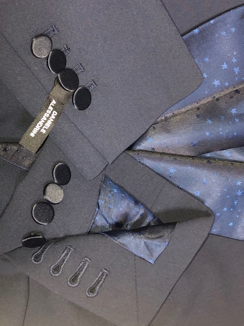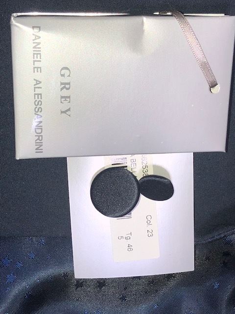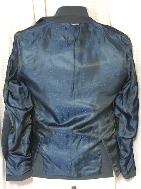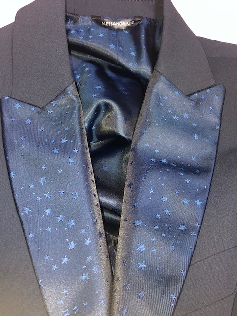 そのイタリアンブランド「DANIELE ALESSANDRINI」の高貴、スタイリッシュ、ファーマルながらイタリアンブランドならではの遊び心ある襟と裏地の☆彡星/Starマークの素敵なアクセント!ネイビーブルーの極上素材(Polyester 66%、Viscosa 28%、Elastin 6% ※ストレッチ感あり、襟の表面はサテン生地)の未使用(店舗にて試着のみ)逸品テーラードジャケット《イタリア製/Made in Italy、サイズ表記EU46≒日本M~L位、各部実寸サイズは、着丈:約66cm-肩幅:約42cm-身幅:約46cm-袖丈:約63cm-袖幅:約12cm※当方アパレルのプロではありませんので多少の誤差はご了承ください-イタリア製/Made in Italy:参考小売価格840ユーロ≒100,328円(2020年2月 イタリア ローマ)》を出品致します。 結婚式・披露宴・二次会のお呼ばれや謝恩会等のパーティーシーンにピッタリです!!