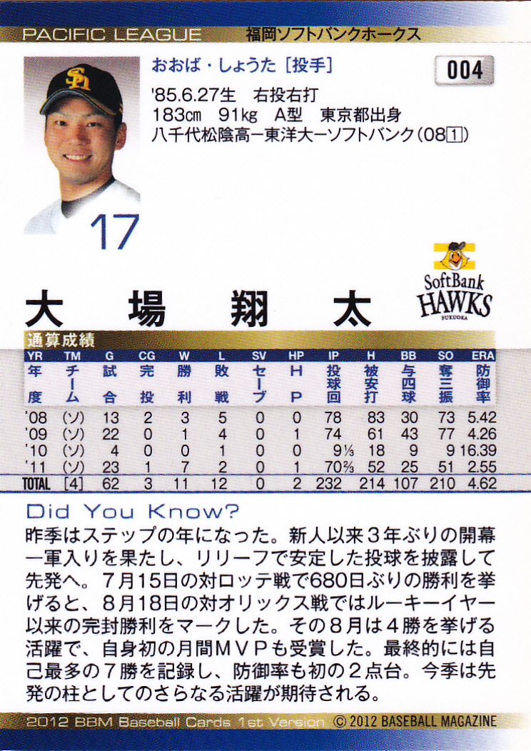 2012BBMベースボールカード1st 004 大場翔太 ソフトバンク ドラフト1位 八千代松陰高校 東洋大 東京都