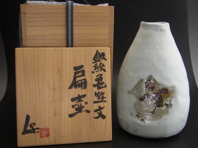 ※下記、【商品詳細】及び【落札後のご案内・注意事項・備考】欄をお読みいただき、ご理解頂いた上でご入札頂けますようお願い致します。 《商品詳細 》 ◆清水保孝作 鉄絵亀遊文 扁壷 共箱 共布を出品致します。 ◆サイズ W:約16㎝ H:約23㎝ D:約14㎝ /外口径:約5.5cm 内口径:約4cm(素人採寸の為、多少の誤差はご了承ください) ◆底部には「保」の陶印(銘)がございます。 ◆付属品:共箱・共布 《商品状態 》 ◆中古品となります。 ◆キズなどなく状態は良好です。 ◆内部もきれいです。 ◆共箱には経年の傷みがございます。 [ ※商品についての注意事項 ] ◆ いずれも画像を良くご確認頂き、ご自身の判断で納得されたうえで入札をお願い致します。 ◆ 画像につきましてはデジカメ撮影の為、実際の色合いと異なる事もありますのでご了承ください。 |