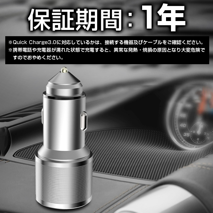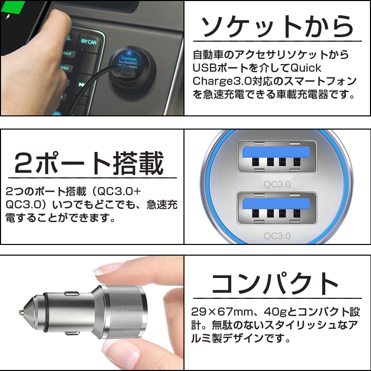 ・自動車のアクセサリソケットからUSBポートを介してQuick Charge3.0対応のスマートフォンを急速充電できる車載充電器です。