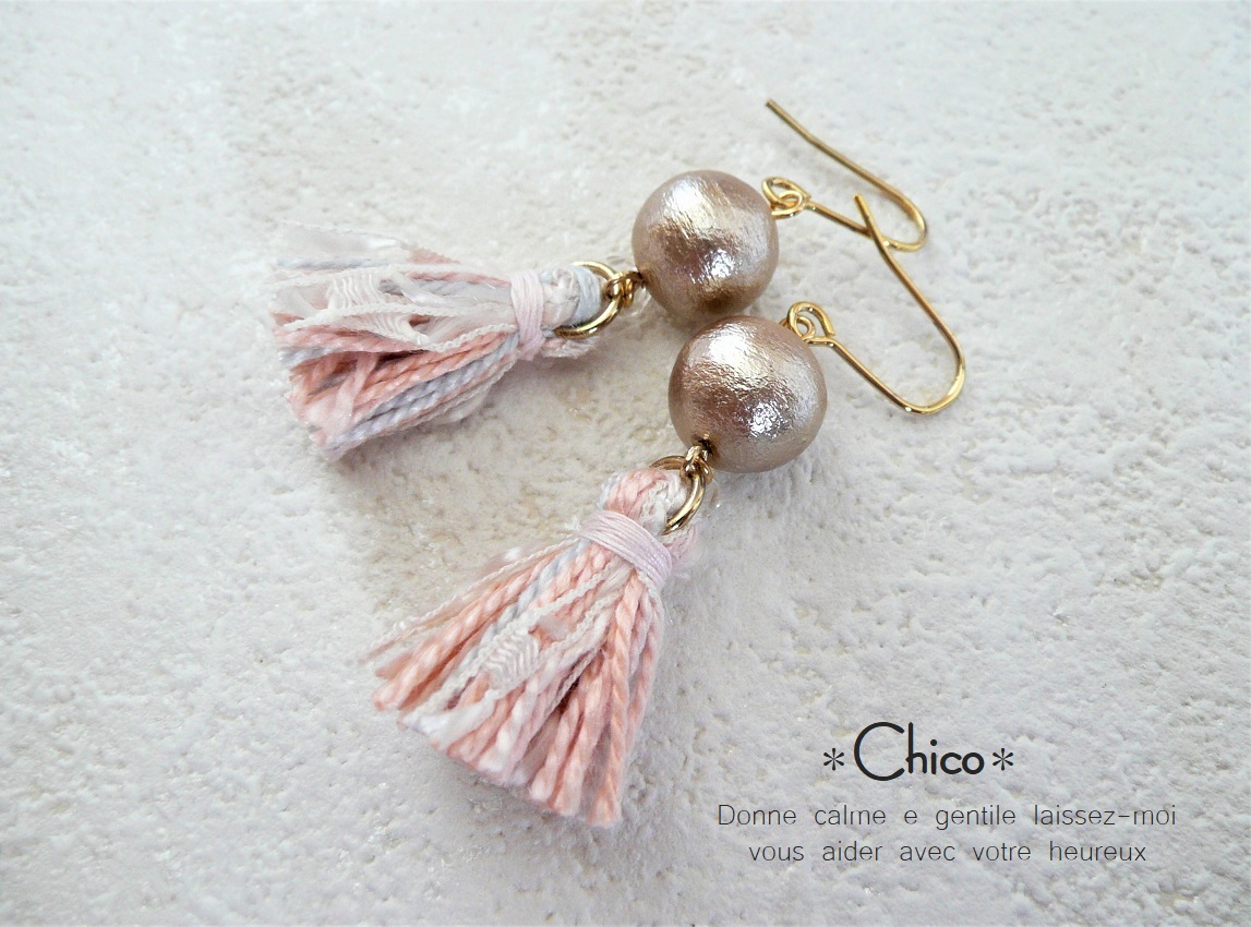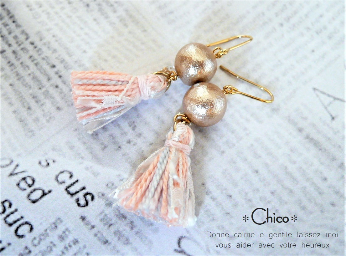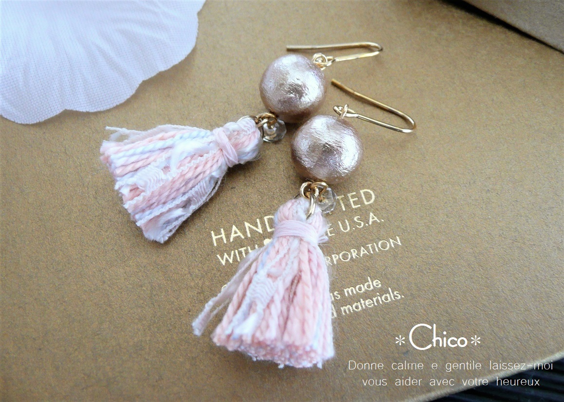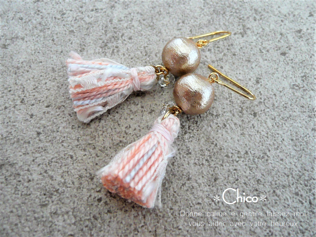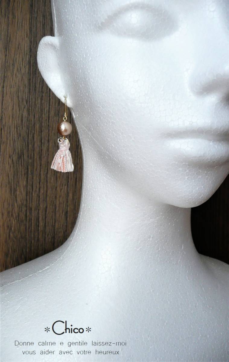 ■シルクタッセル ピンク系&ベージュコットンパール ハンドメイドピアス ♪ ★2点以上送料無料!★