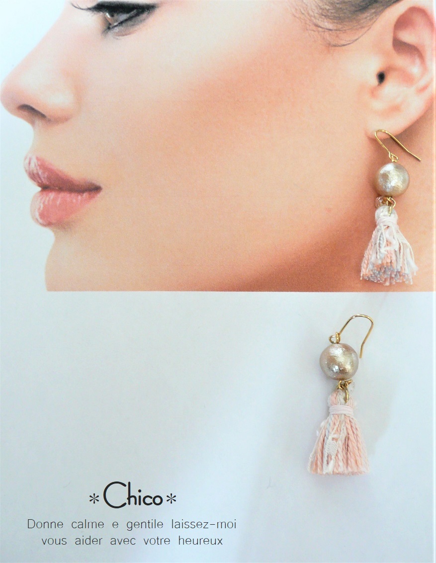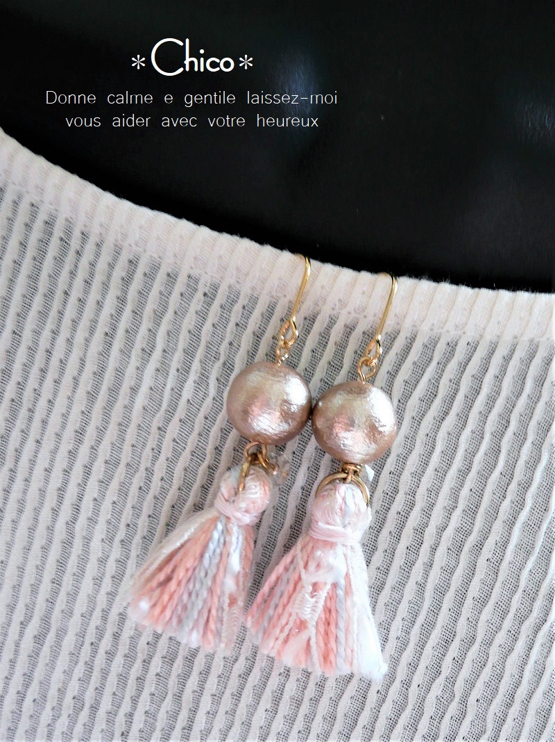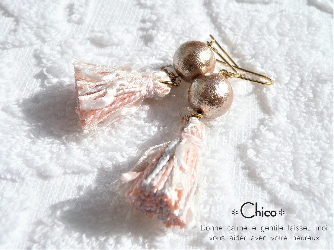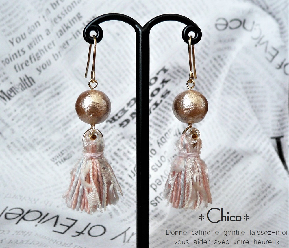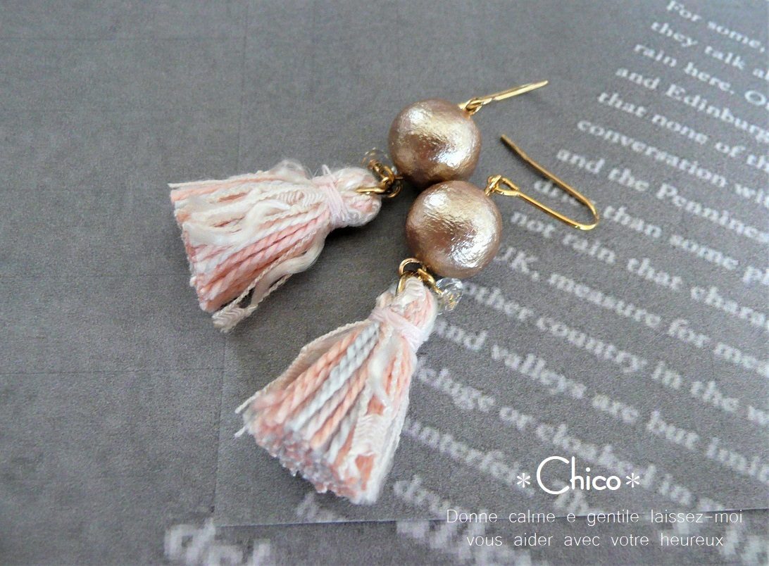 ■シルクタッセル ピンク系&ベージュコットンパール ハンドメイドピアス ♪ ★2点以上送料無料!★