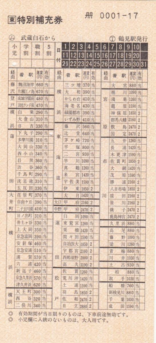 【JR東日本】〇T 鶴見駅発行 〇ム武蔵白石駅から 駅名式特別補充券