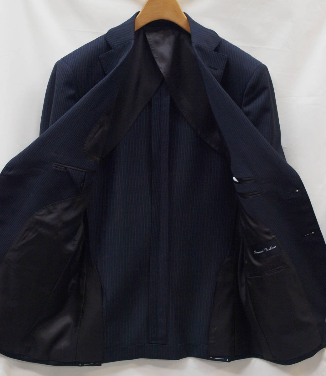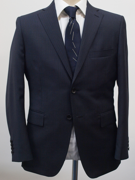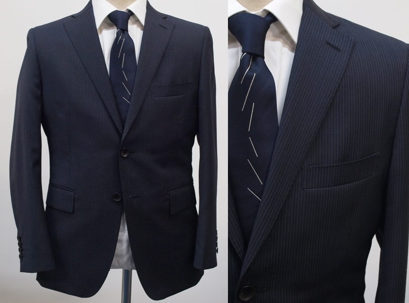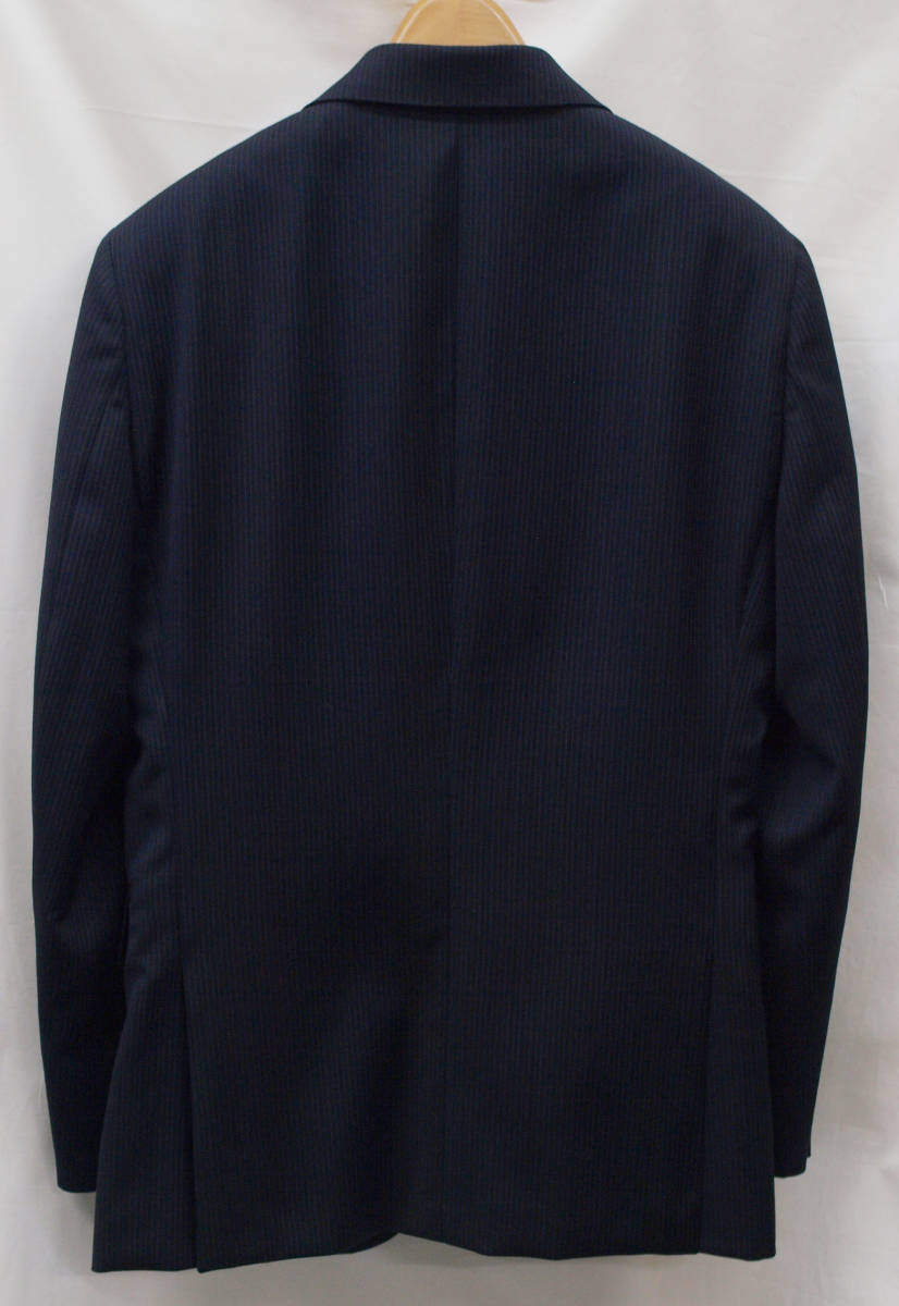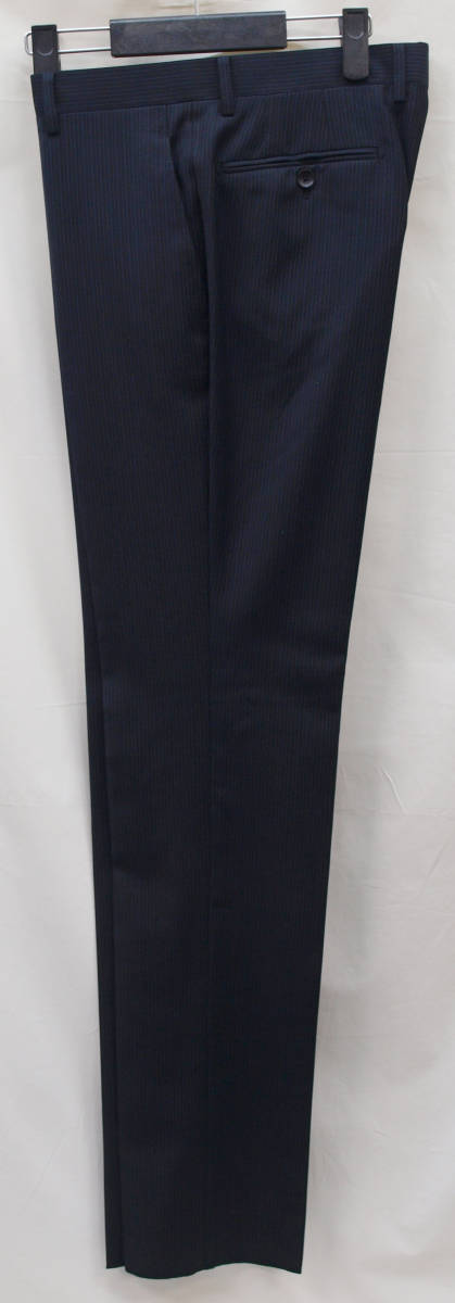 【サイズ】 A5 (AM号相当) 目安の体型 身長165cm~175cm、ウエストサイズ80cm前後 【ジャケット実寸】 肩幅43.5cm 着丈69.5cm 袖丈60cm 脇下部分51cm 身幅46cm 【パンツ実寸】 ウエスト(胴回り実寸)80cm (平置きでかるくはかると80cmでひっぱってはかると83cmです。股上が浅いため3cmほど実寸が大きくなります。) わたり幅31.5cm 股下から10cm下の部分28.5cm 裾幅19cm 脇股上22.5cm 前股上25cm 股下90cm(裾上げ未処理の状態/新品) 【デザイン】 すっきりとしたコンパクトな印象の細身シルエット、タイトフィット、スリムフィット、ビジネススーツ新品、裾上げしていない状態です。 ・ジャケットはシングル2つボタンで細身タイトフィットスリムモデル ・パンツは股上が浅いスリムシルエット、ノータックスリムテーパードパンツ 【仕様】 ・ジャケットはシングル2つボタン、ノッチドラペル、襟縁等AMFステッチ入り、袖口ボタン4つ、サイドベンツ、内ポケット4つ(小ポケット2つ含む)、背抜き(春夏物) ・パンツはノータック、脇ポケット斜め付け、後ろポケット両玉縁で左のみボタン付き、フロントはファスナーでボタン&ホック仕様、うちかけボタンあり、ヒザ裏当て付き きちんとしたビジネススーツの縫製仕様で仕上がっております。 【素材】 表地:ウール50% ポリエステル50% 裏地:胴裏/ポリエステル100% 袖裏/ポリエステル100% 真夏対応の清涼スーツ生地ほど透け感はなく、やや薄手くらいの春夏向け紳士スーツ用ウールブレンド素材を使用 【色】 黒にちかい濃紺色 【柄】 ミディアムグレーとブルーグレーのラインが3mm間隔で交互にはいったストライプ柄 春先~夏~秋口にかけて春夏メインのシーズン対応スーツ