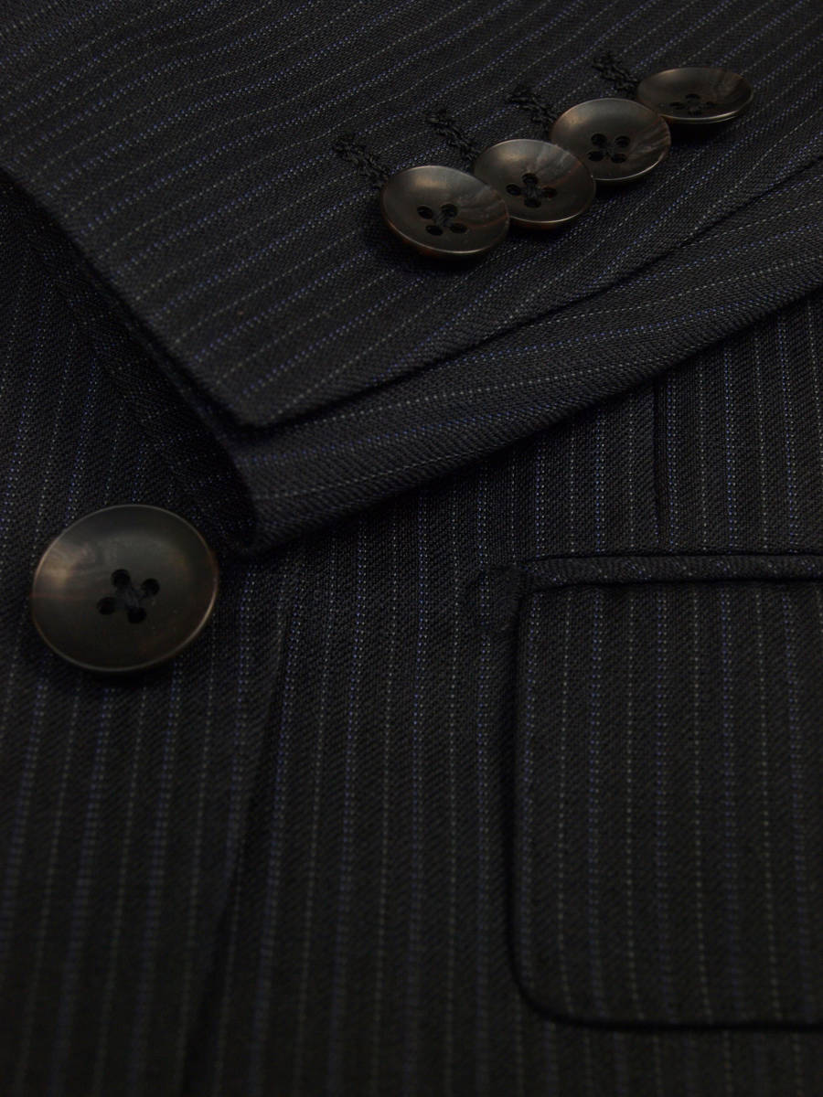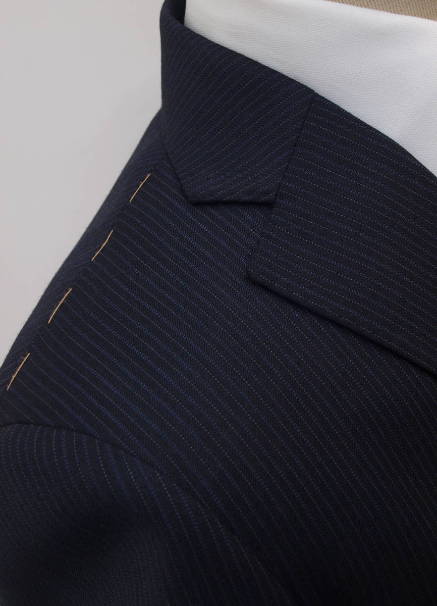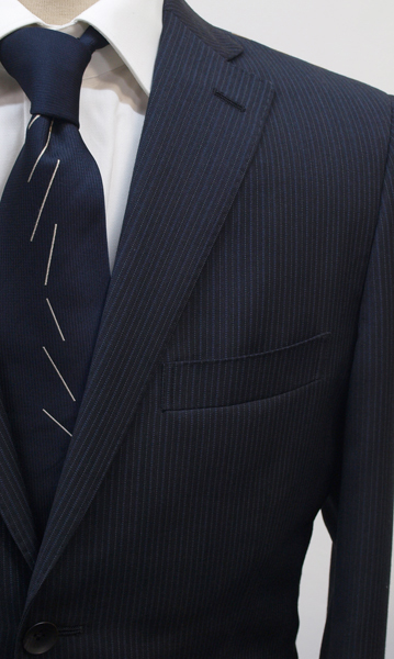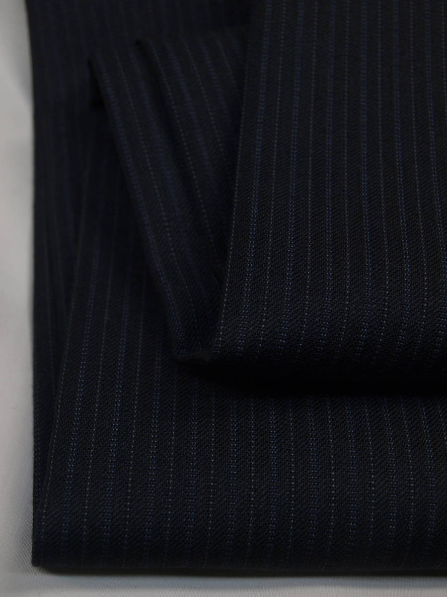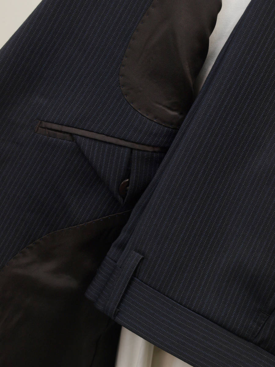 【サイズ】 A5 (AM号相当) 目安の体型 身長165cm~175cm、ウエストサイズ80cm前後 【ジャケット実寸】 肩幅43.5cm 着丈69.5cm 袖丈60cm 脇下部分51cm 身幅46cm 【パンツ実寸】 ウエスト(胴回り実寸)80cm (平置きでかるくはかると80cmでひっぱってはかると83cmです。股上が浅いため3cmほど実寸が大きくなります。) わたり幅31.5cm 股下から10cm下の部分28.5cm 裾幅19cm 脇股上22.5cm 前股上25cm 股下90cm(裾上げ未処理の状態/新品) 【デザイン】 すっきりとしたコンパクトな印象の細身シルエット、タイトフィット、スリムフィット、ビジネススーツ新品、裾上げしていない状態です。 ・ジャケットはシングル2つボタンで細身タイトフィットスリムモデル ・パンツは股上が浅いスリムシルエット、ノータックスリムテーパードパンツ 【仕様】 ・ジャケットはシングル2つボタン、ノッチドラペル、襟縁等AMFステッチ入り、袖口ボタン4つ、サイドベンツ、内ポケット4つ(小ポケット2つ含む)、背抜き(春夏物) ・パンツはノータック、脇ポケット斜め付け、後ろポケット両玉縁で左のみボタン付き、フロントはファスナーでボタン&ホック仕様、うちかけボタンあり、ヒザ裏当て付き きちんとしたビジネススーツの縫製仕様で仕上がっております。 【素材】 表地:ウール50% ポリエステル50% 裏地:胴裏/ポリエステル100% 袖裏/ポリエステル100% 真夏対応の清涼スーツ生地ほど透け感はなく、やや薄手くらいの春夏向け紳士スーツ用ウールブレンド素材を使用 【色】 黒にちかい濃紺色 【柄】 ミディアムグレーとブルーグレーのラインが3mm間隔で交互にはいったストライプ柄 春先~夏~秋口にかけて春夏メインのシーズン対応スーツ