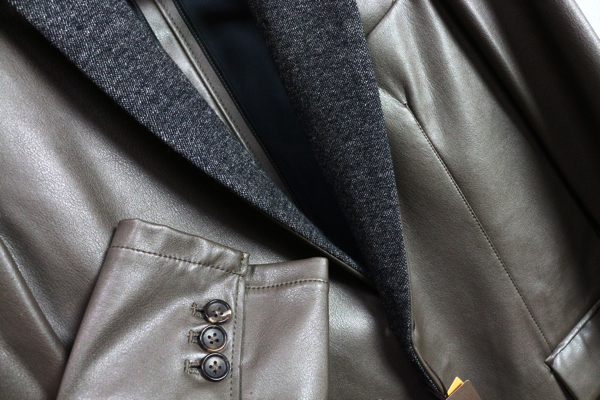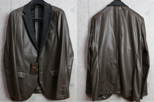 フェイクレザーとニット素材のコンビネーションジャケットです。ニットは国内の尾州で編みと整理をしたメイドインジャパンの生地です。フェイクレザーはストレッチ性が素晴らしく、腕の上げ伸ばしや着心地が快適です。水洗いが出来るというのも特徴です。