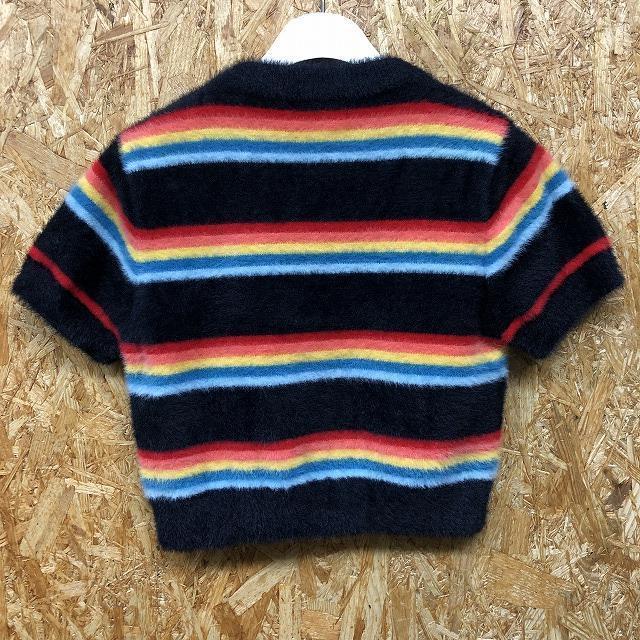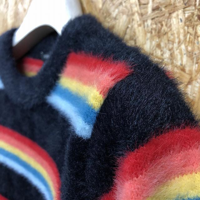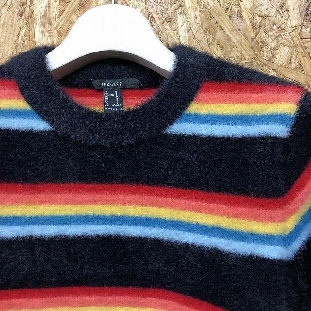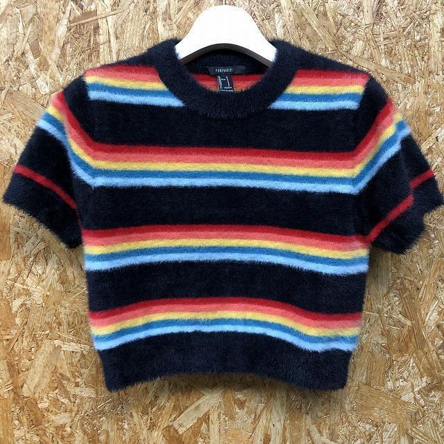 商品タイトル | FOREVER21 フォーエバー21 S レディース(キッズ?) シャギーニット セーター マルチボーダー クルーネック 半袖 黒×赤系×青系×黄 |