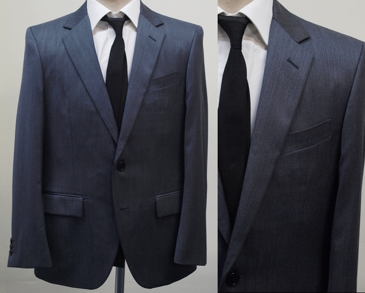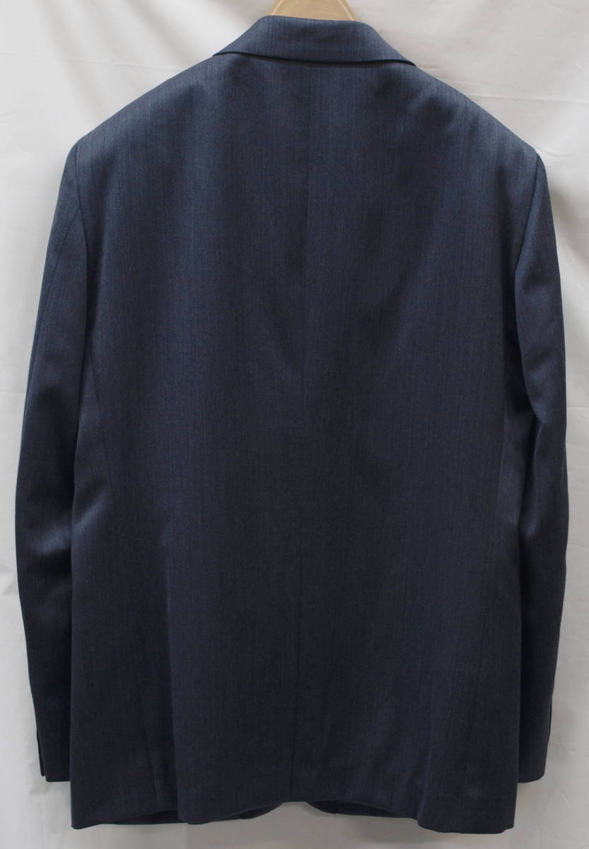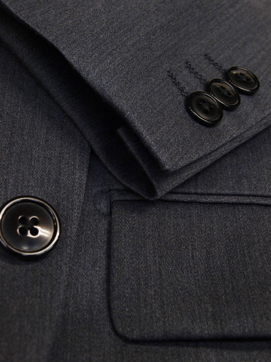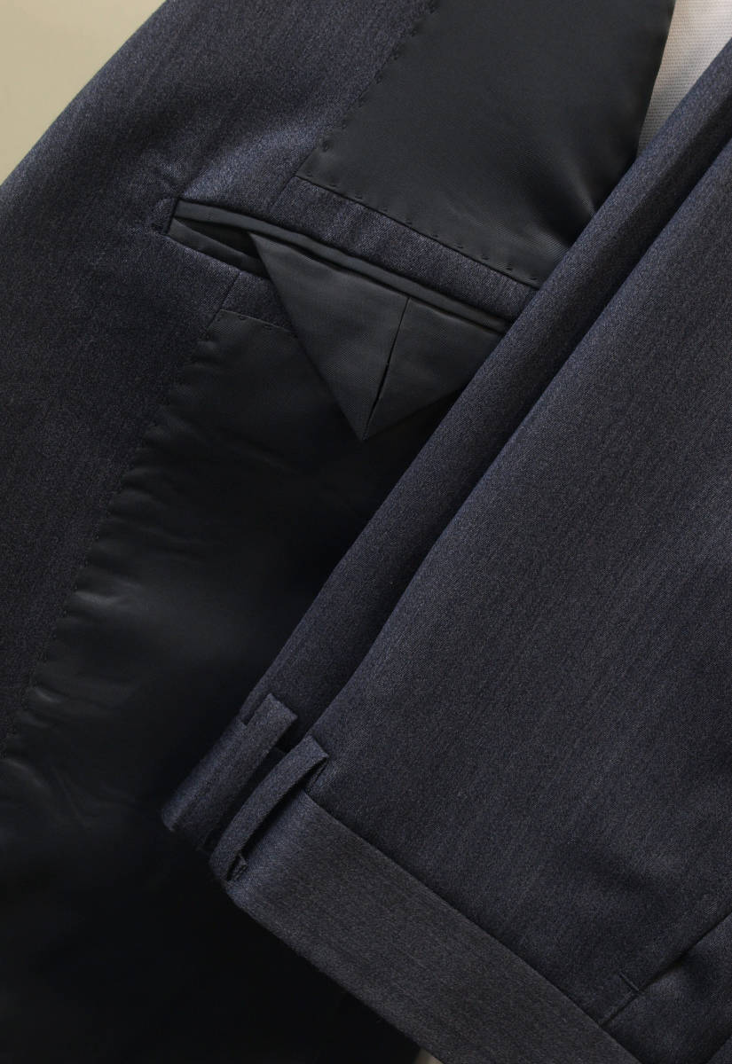 【サイズ】 AB7 (ABLL号相当) 目安の体型 身長175cm~185cm、ウエストサイズ90cm前後 【ジャケット実寸】 肩幅47cm 着丈73.5cm 袖丈64cm 脇下部分54cm 身幅50cm 【パンツ実寸】 ウエスト(胴回り実寸)90cm (平置きでかるくはかると90cmでひっぱってはかると92cmです。股上がやや浅いため実寸が2cmほど大きめに作られております。) わたり幅33cm 股下から10cm下の部分30.5cm 裾幅19.8cm 脇股上25.5cm 前股上26cm 股下95cm(裾上げしていない状態/新品) 【デザイン】 すっきりとしたコンパクトな印象の細身シルエット、タイトフィット、スリム、ビジネススーツ新品、裾上げしていない状態です。 ・ジャケットはシングル2つボタンでタイトフィットスリムモデル ・パンツは股上がやや浅めで細いシルエットのノータックスリムテーパードパンツ 【仕様】 ・ジャケットはシングル2つボタン、ノッチドラペル、袖口ボタン3つ、センターベント、内ポケット4つ(小ポケット2つ含む)、背抜き(秋冬物) ・パンツはノータック、膝裏当て付き、脇ポケット斜め付け、後ろポケット両玉縁で左のみボタン付き、フロントはファスナーでボタン&ホック仕様/うちかけボタンあり きれいな縫製仕立てできちんとしたビジネススーツの仕様で仕上がっております。 【素材】 表地:ウール60% ポリエステル37% シルク3% 裏地:胴裏/ポリエステル100% 袖裏/ポリエステル100% ・透け感はないですがそれほど厚みがなく適度なハリがある秋冬向け紳士スーツ向けシルクウールブレンド生地を使用 【色】 チャコールグレー 【柄】 縦方向の杢調無地 秋~冬~春先にかけて秋冬メインのシーズン対応商品