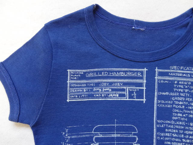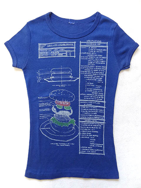 ビンテージ 希少 珍品 グリル ハンバーガー レシピ プリント レディース リブ Tシャツ 青 ブルー フレンチ レア クッキング 料理 サイズ S