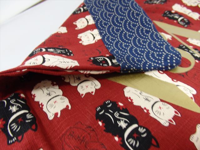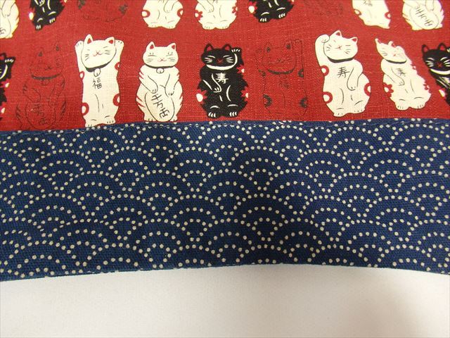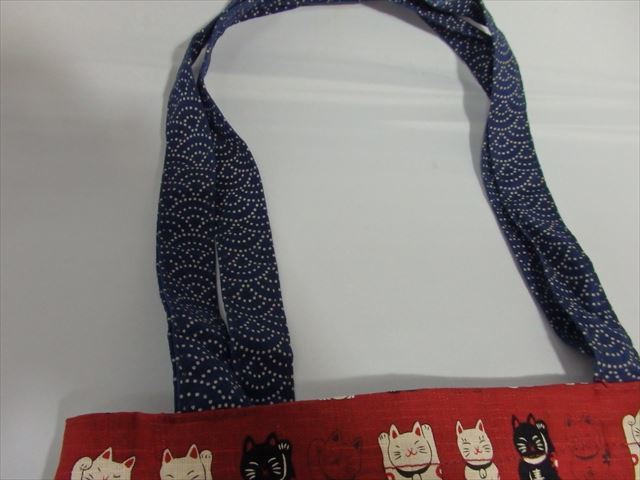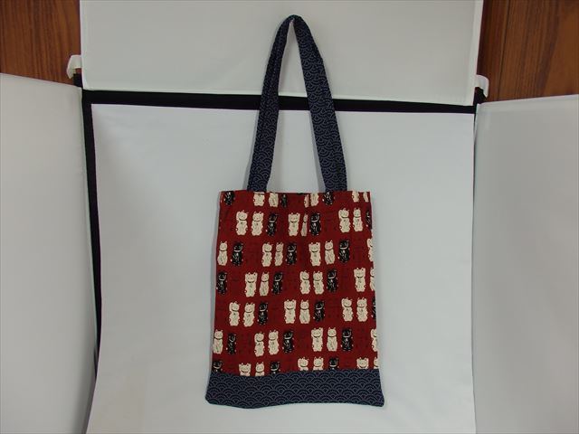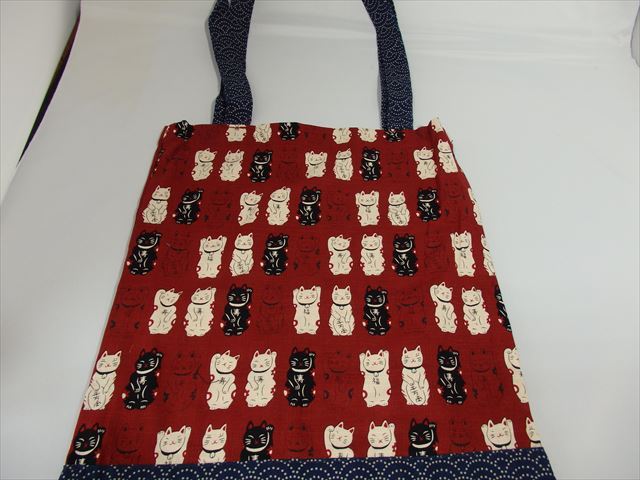 (招き猫)コットントートバッグ。「ラッキーキャット」をモチーフにした繰り返しパターンが特徴です。