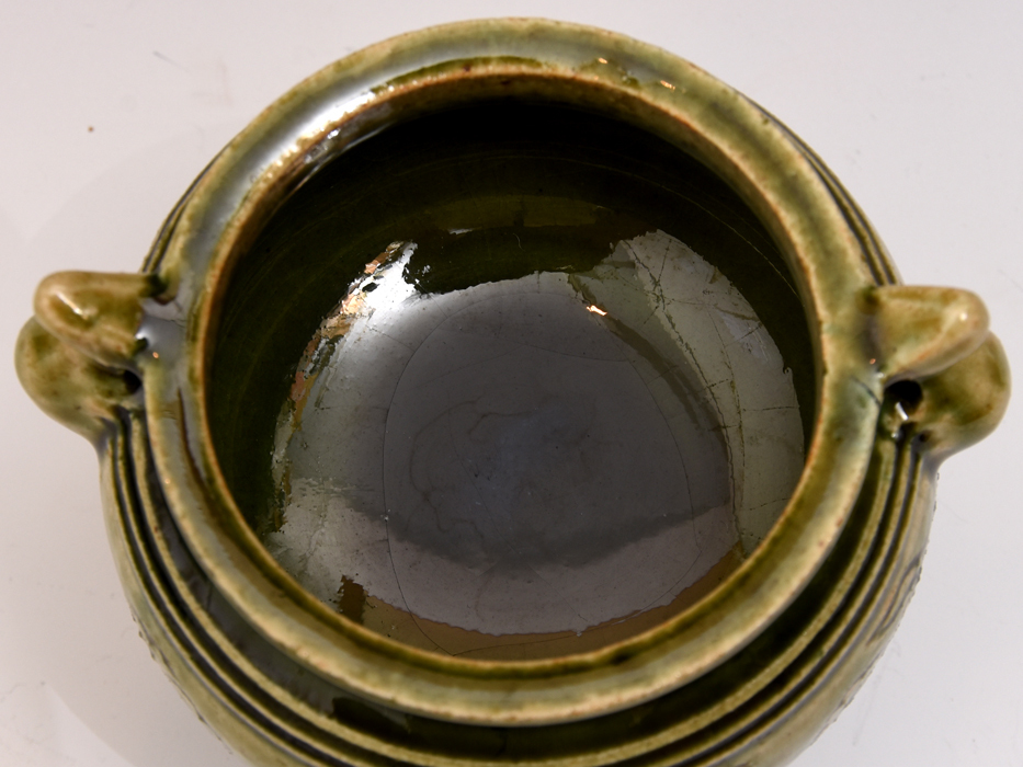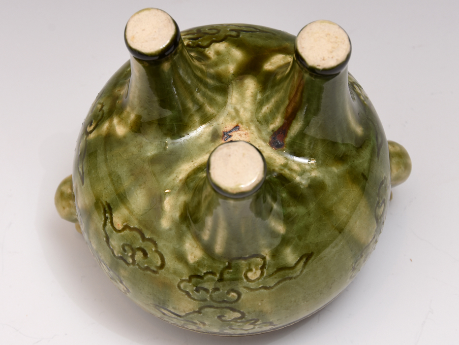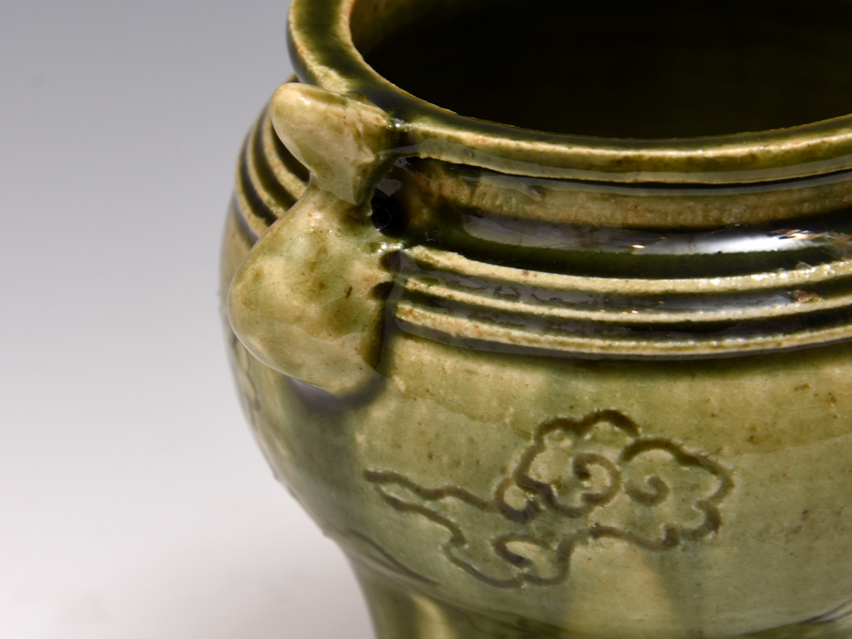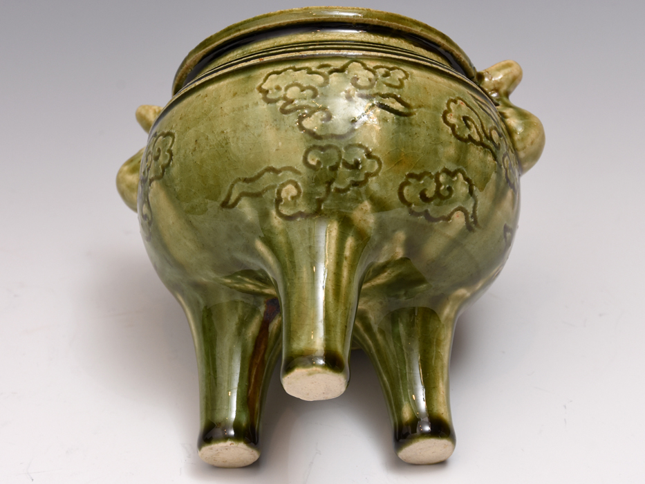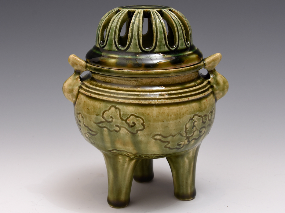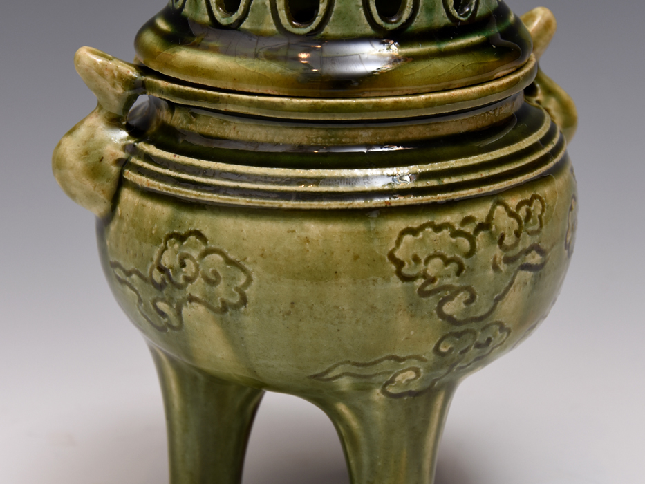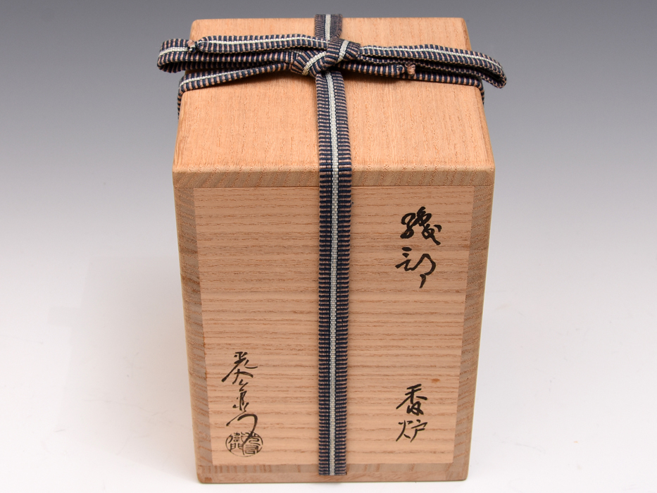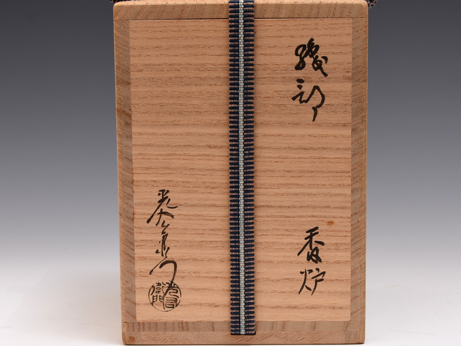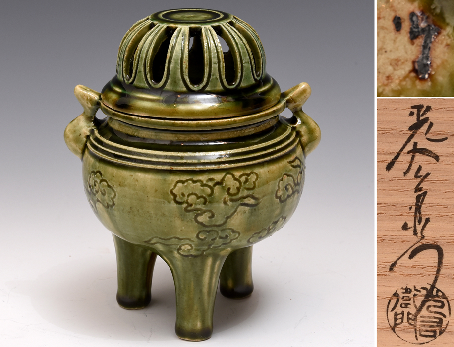 山十窯 加藤光右衛門(造)織部雲文三足香炉 共蓋 双耳 共箱 共布 香道具 茶道具 現代工芸 美品 |