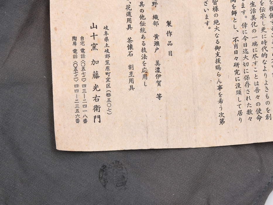 加藤光右衛門 山十窯 本名は光夫 美濃焼伝統工芸士、名古屋茶道工芸金鱗会会員 1,937年 加藤十右衛門の次男として生まれ 他の兄弟も陶芸家のため、加藤三兄弟として有名な作家 高校を卒業してから父親に師事し、陶芸を学ぶ その後、独立して窯を築き、美濃伊賀、黄瀬戸、黒織部を中心に茶陶を制作 また、中日国際展や朝日陶芸展などの公募展でも活躍し、個展も数多く開催 |
