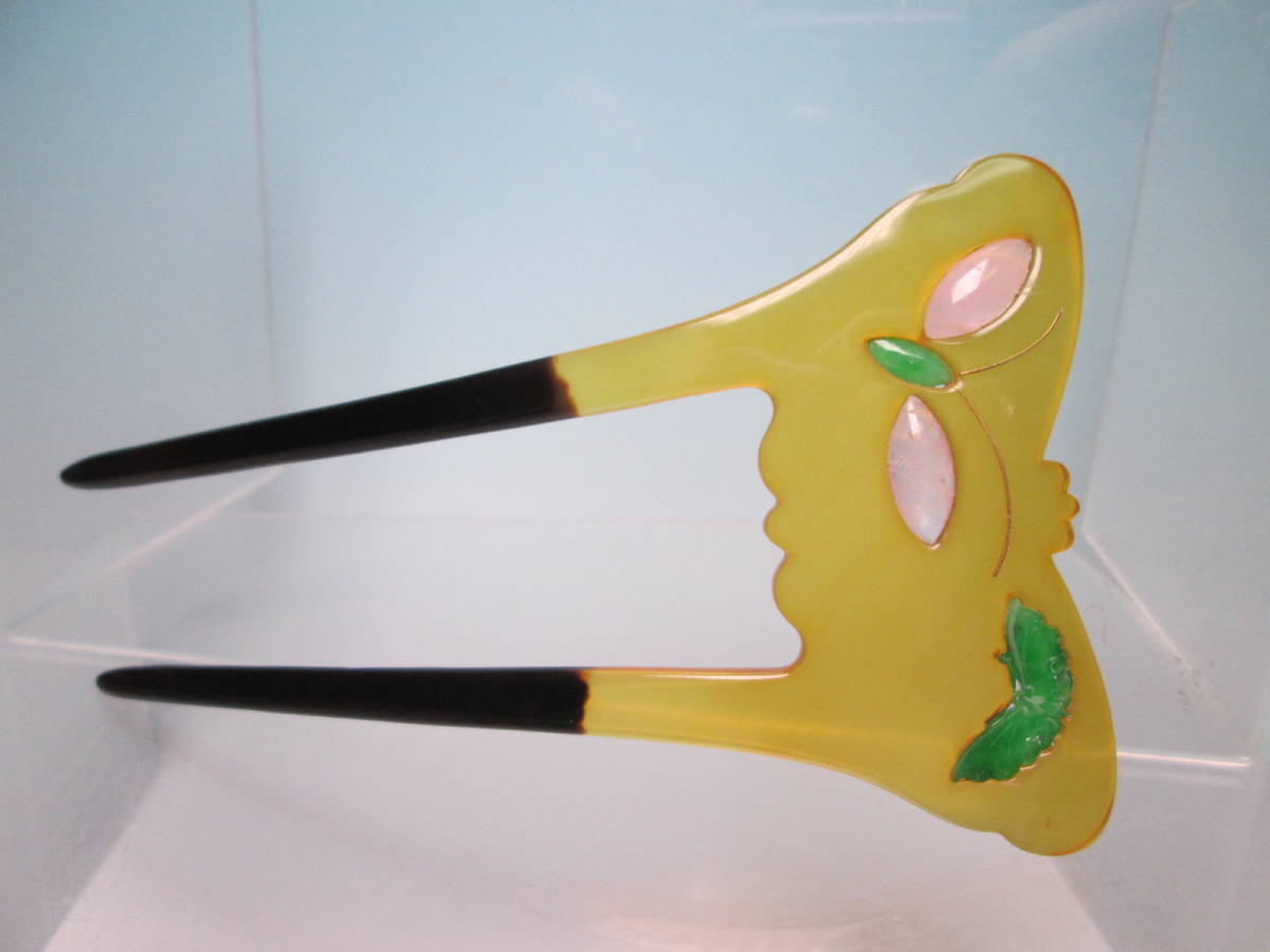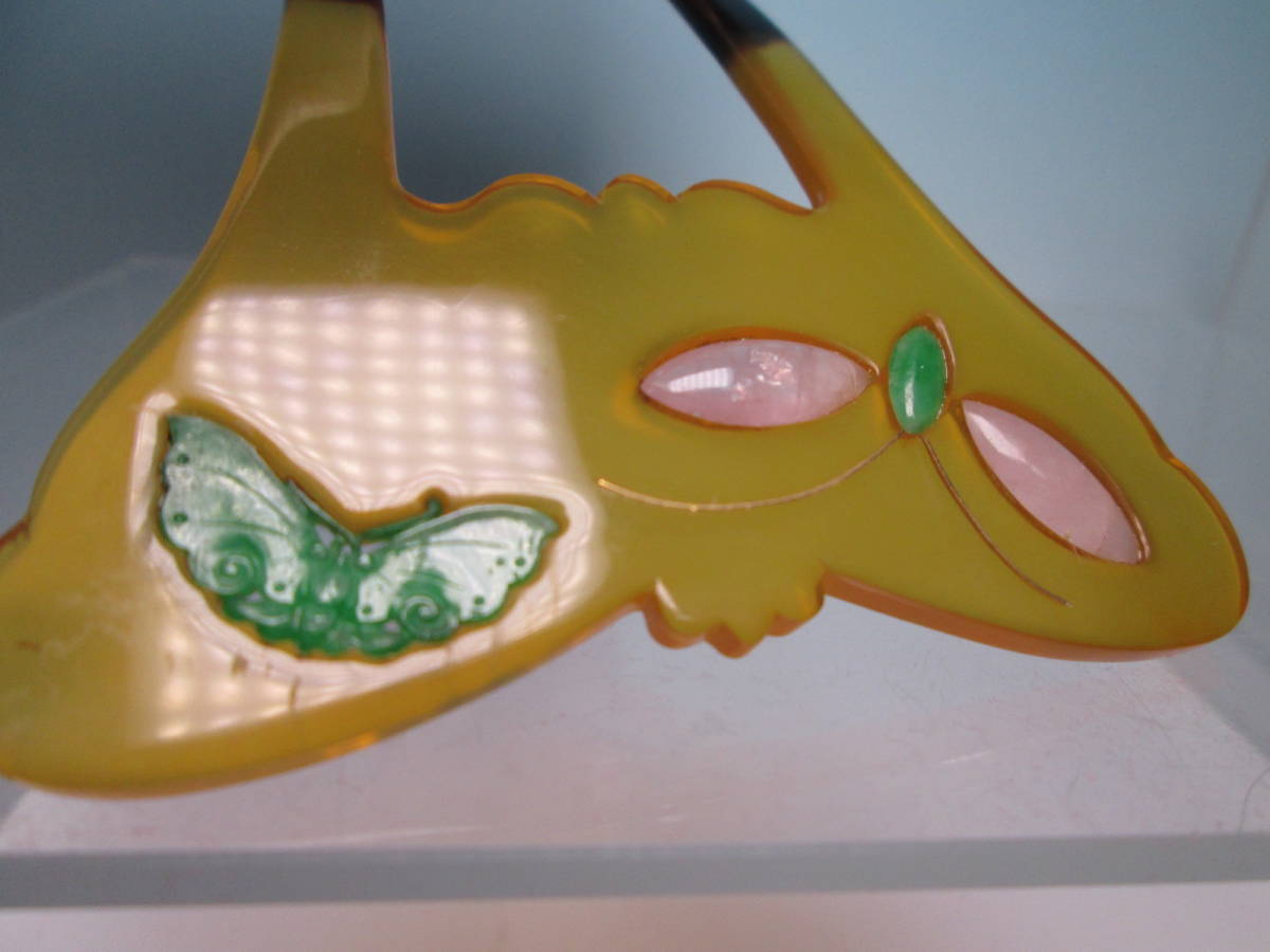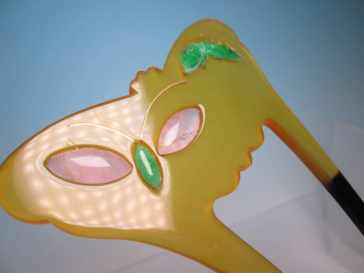 【江月】アンティーク・巴 本鼈甲 本翡翠&ローズクオーツ金線象嵌細工蝶のかんざし 共ケース付