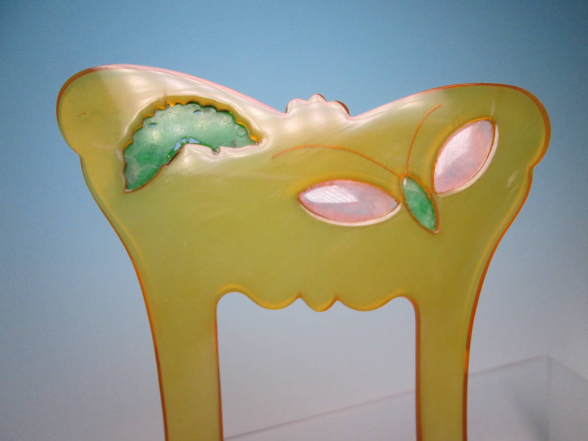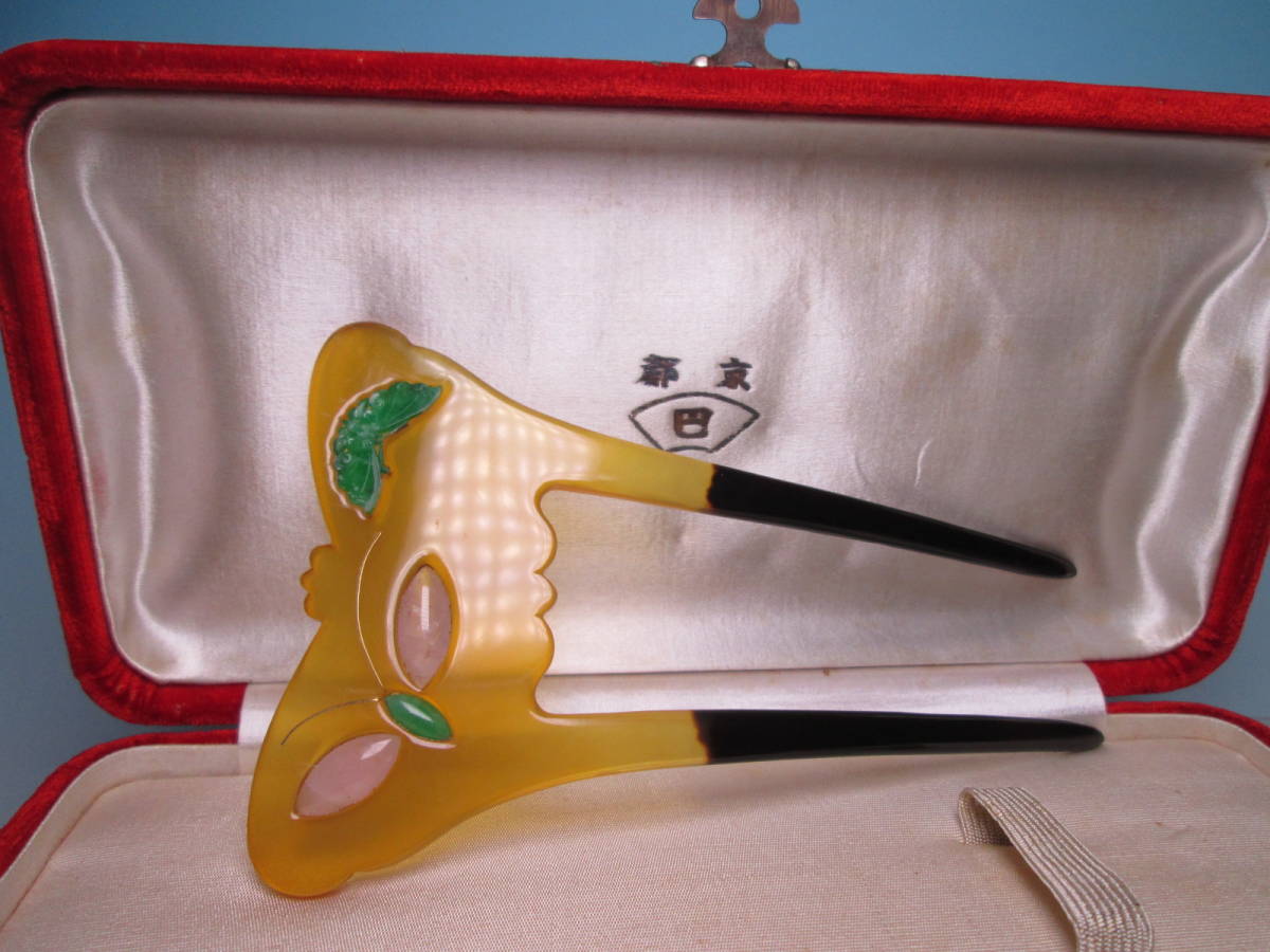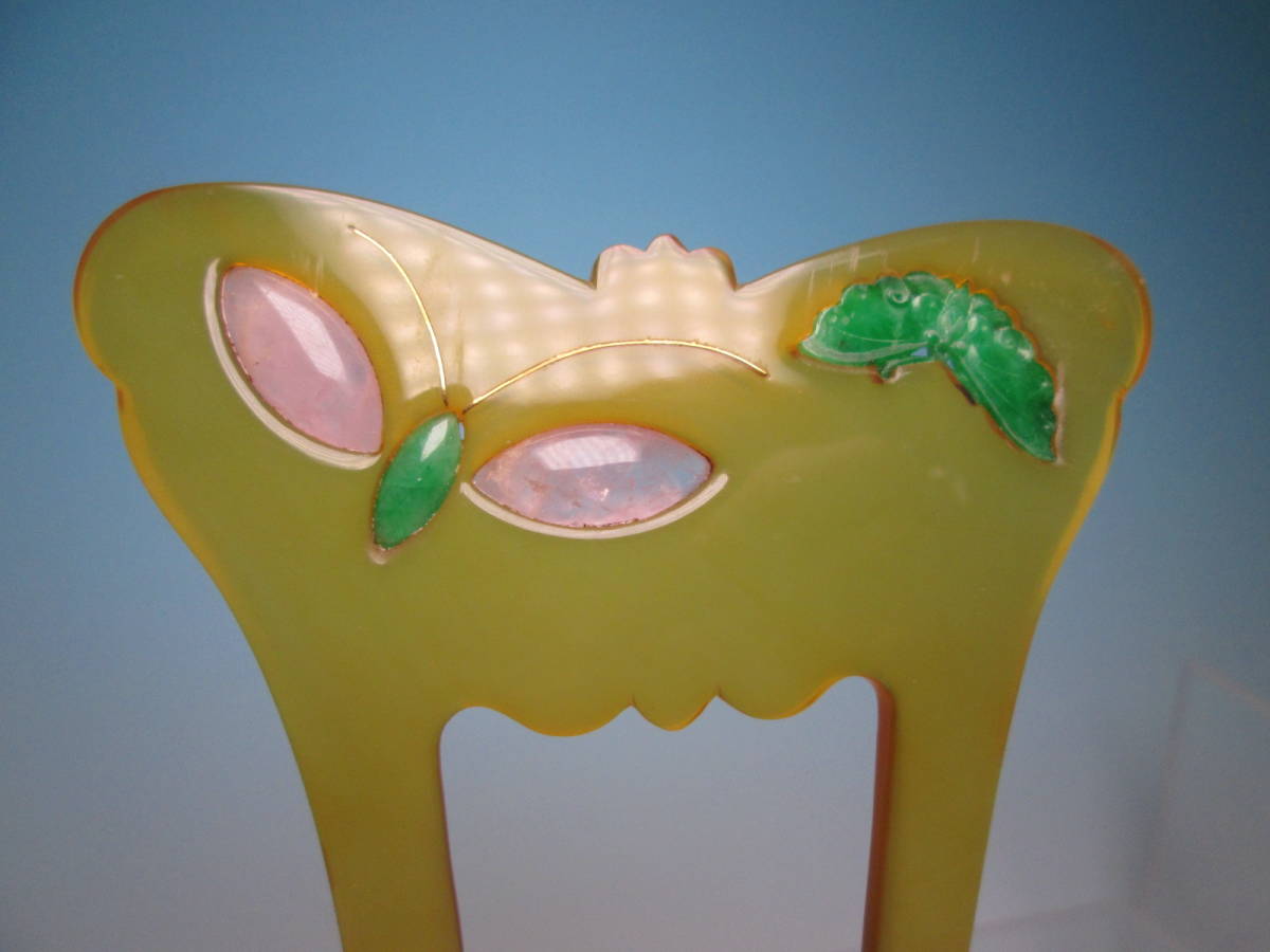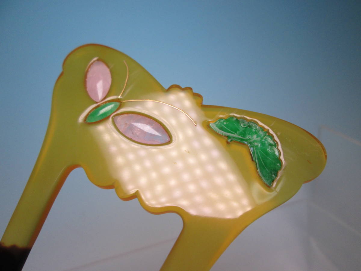 【江月】アンティーク・巴 本鼈甲 本翡翠&ローズクオーツ金線象嵌細工蝶のかんざし 共ケース付