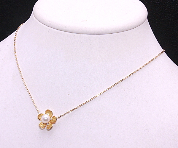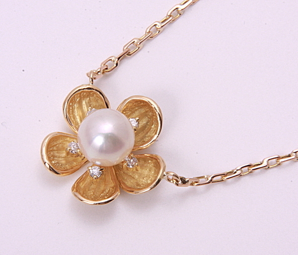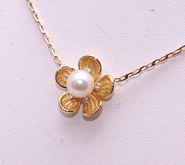 花のモチーフにアコヤ真珠とダイアが輝くネックレスです。