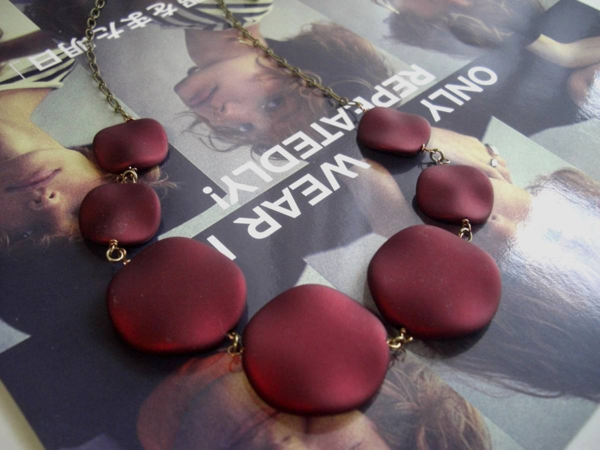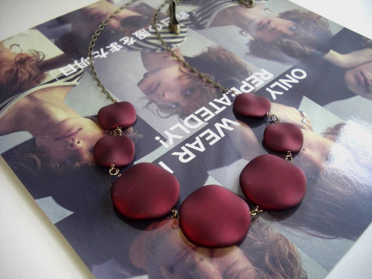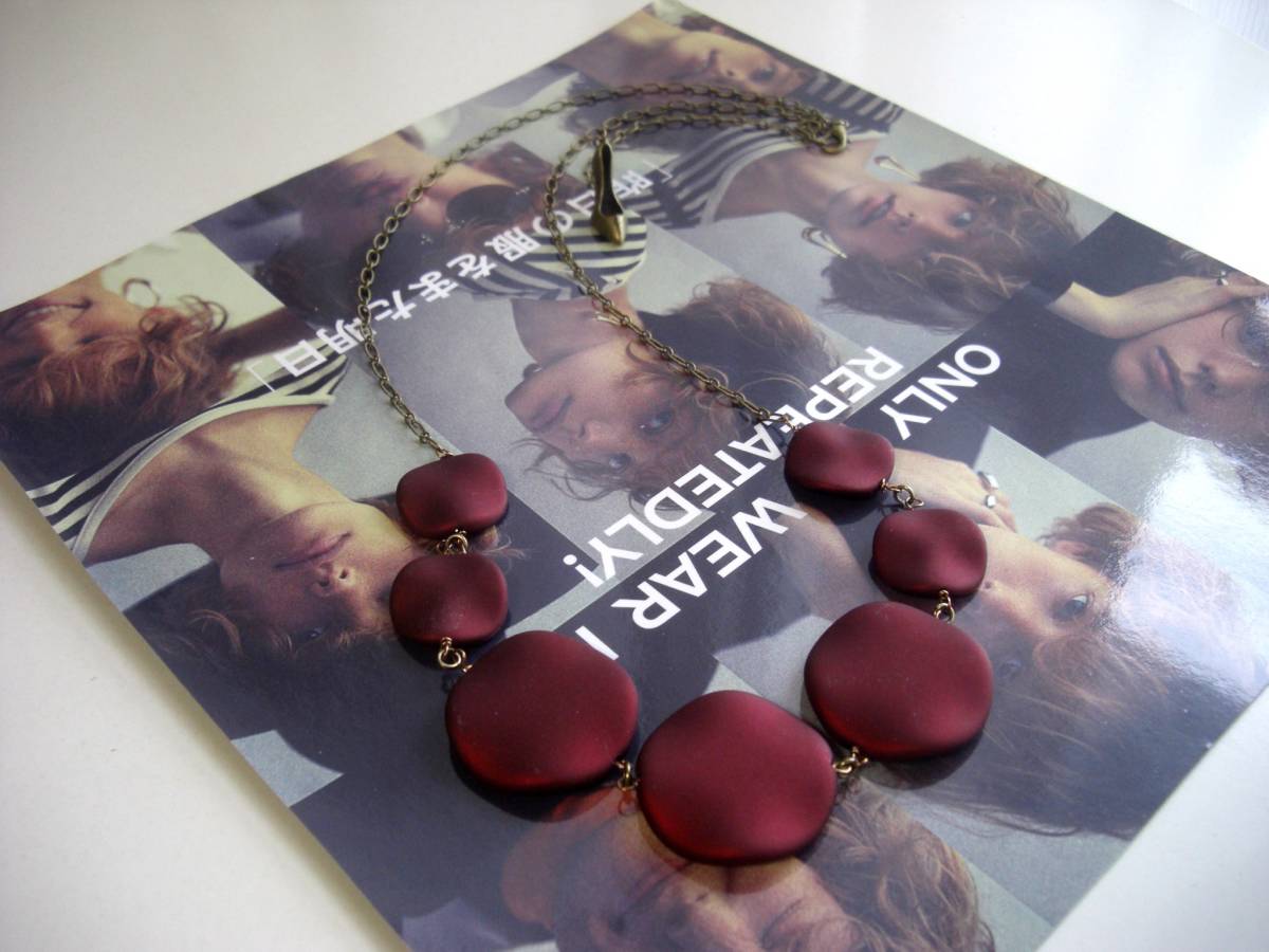 さりげなく個性的・・シリーズです♪お気に入りの色とデザインで・・シックな赤の樹脂ビーズのネックレスです♪マットな深い赤のビーズがひっそり華やかな表情です♪ウェーブコインの樹脂ビーズは20ミリ、30ミリの大きさ違いです♪デザインチェーンで繋ぎました♪長さは全長80センチ位で調節自由です♪お色違いのシリーズやお揃いのピアスも出品しています♪シンプルで飽きのこないいつまでも着けられるデザインを考えて作りました!ハンドメイドをご理解頂いて ノークレーム、ノーリターンでお願いします
