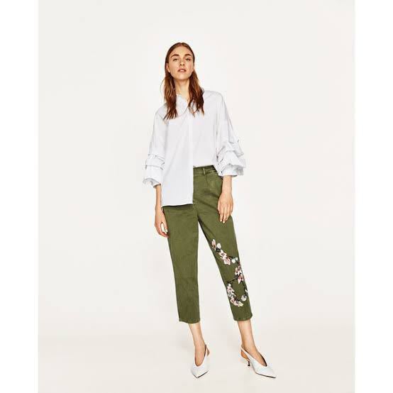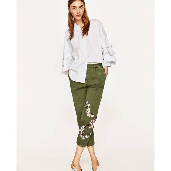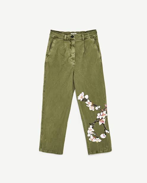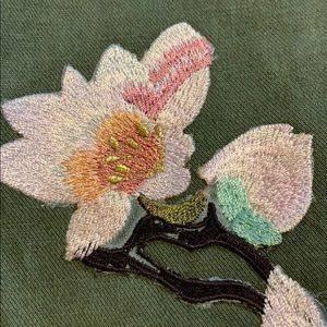 キレイ目カーキに日本の桜を立体的に刺繍したアーティスティックなパンツ。金糸も施されゴージャス。