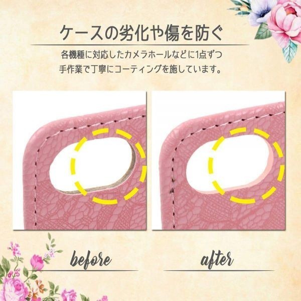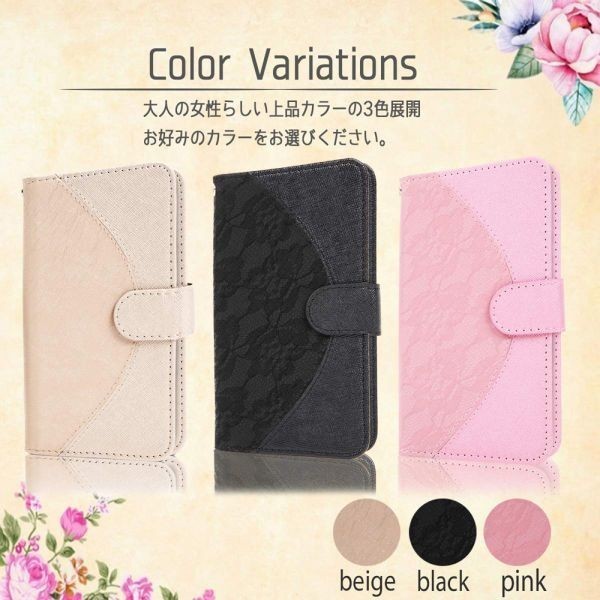 花柄 レース模様 × 高級感のある 型押しレザー ベルト付き 手帳型ケース。