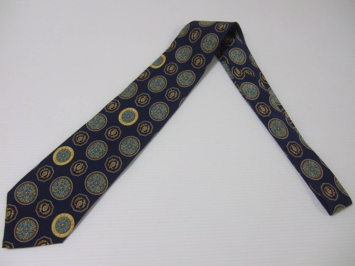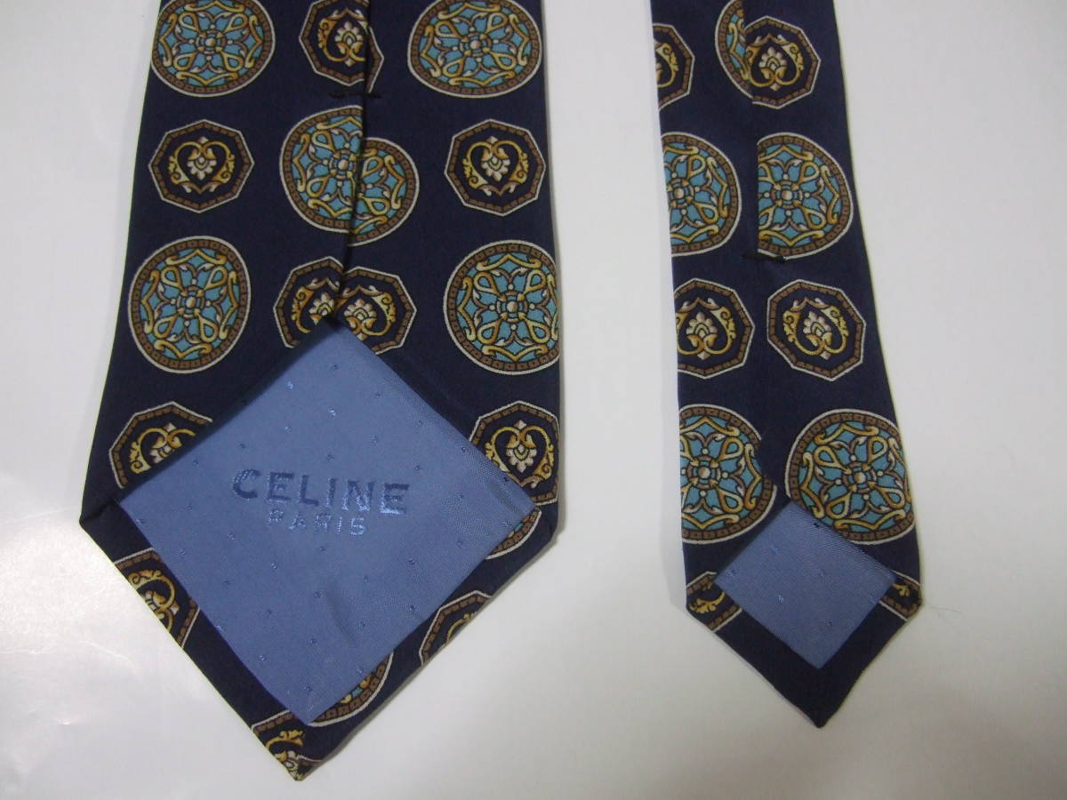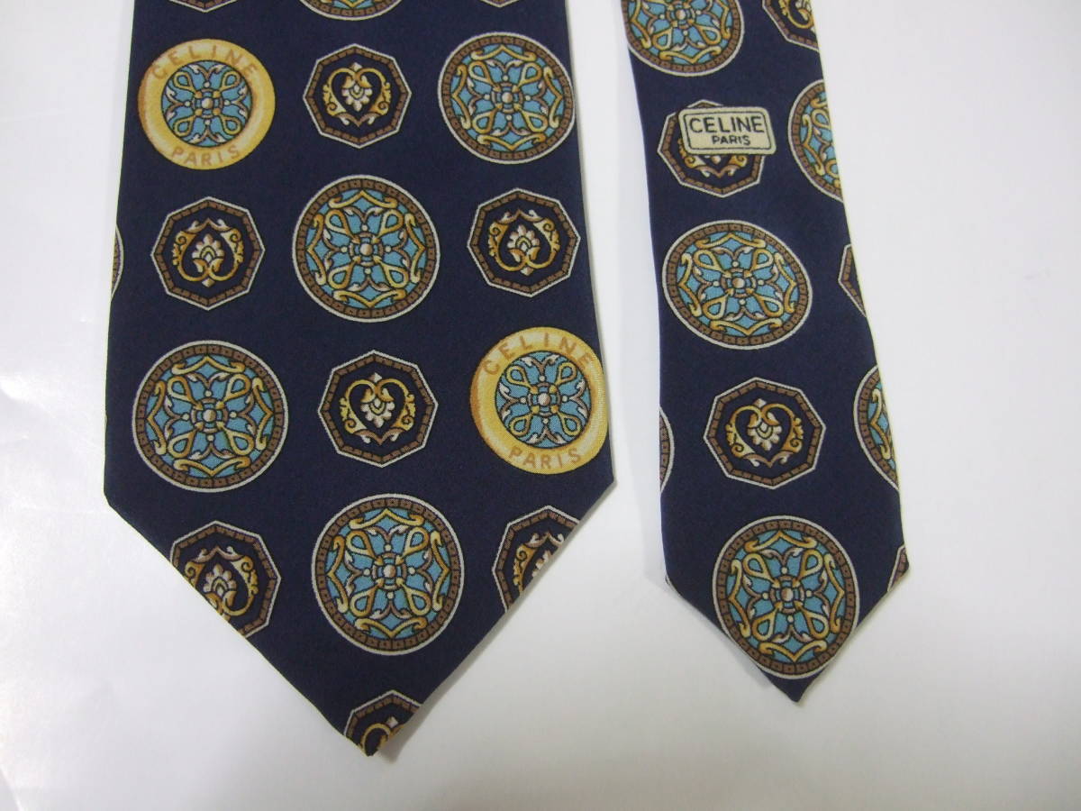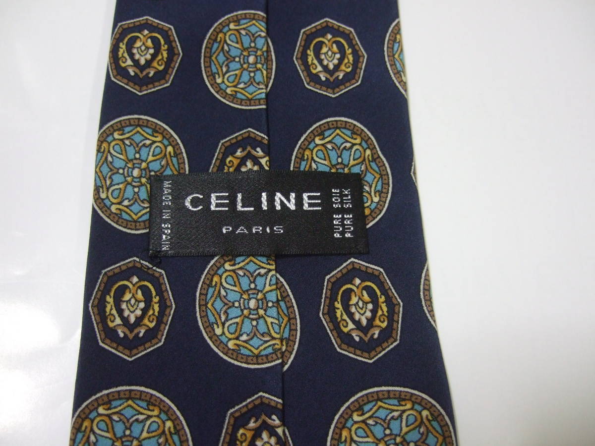 CELINE セリーヌ スペイン製 ネイビー 柄物 高級ブランド ネクタイ シルク 紺