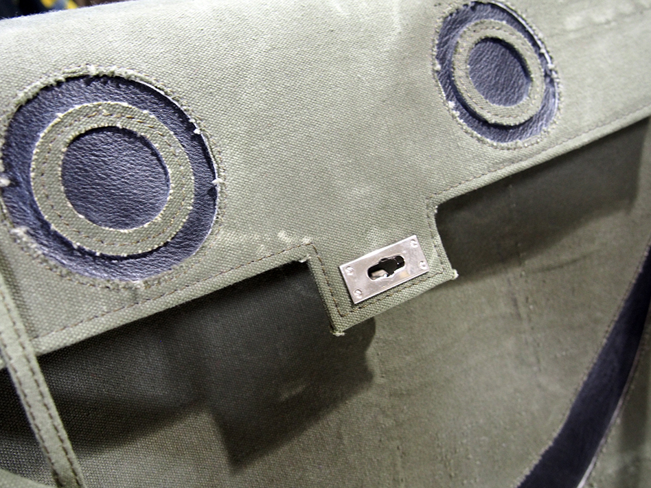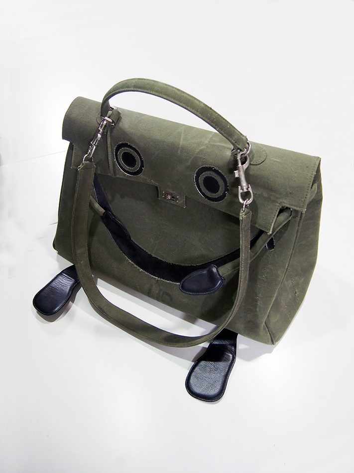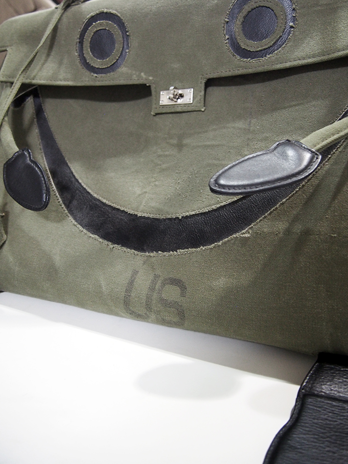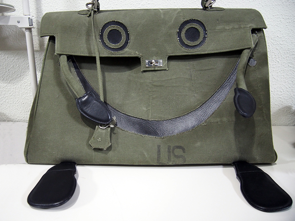 READYMADE×A LOVE MOVEMENTのUS ARMYのヴィンテージダッフルバッグを解体し再構築した、目や口に手足が付いた洒落っ気と愛嬌がたっぷりのDOLL BAGです。ビンテージミリタリーアイテムを 100パーツ以上に及ぶパターン数に解体し、再構築するなど全てが1点物となっているらしく、中でもこちらのラージサイズは珍しく球数の少ない逸品との説明を受けて購入しました。