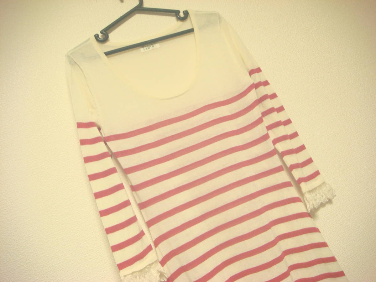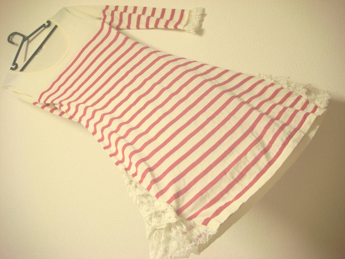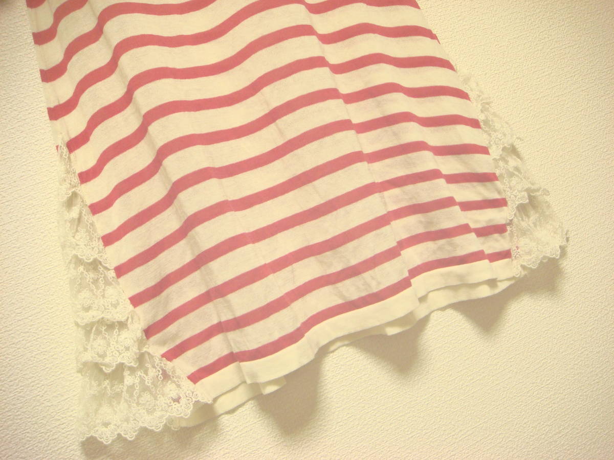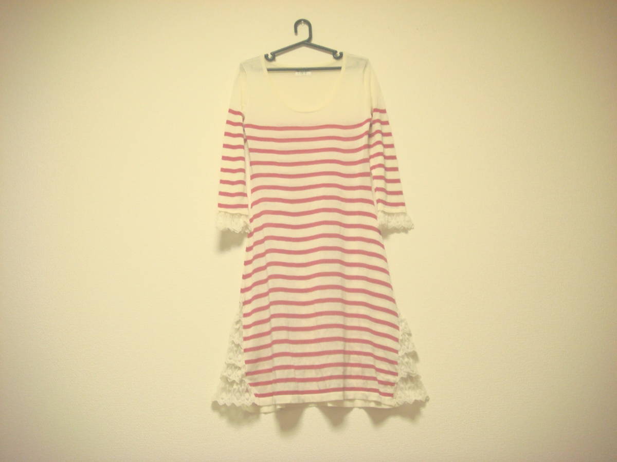 h bis コシノヒロコ ボーダー レースフリル 切り替え ワンピース ピンク 美品 伸縮性 薄手