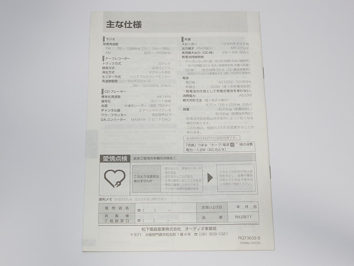 【中古 - 取説】 Panasonic  RX-DS11  CDラジカセ  ポータブルステレオCDシステム  取扱説明書